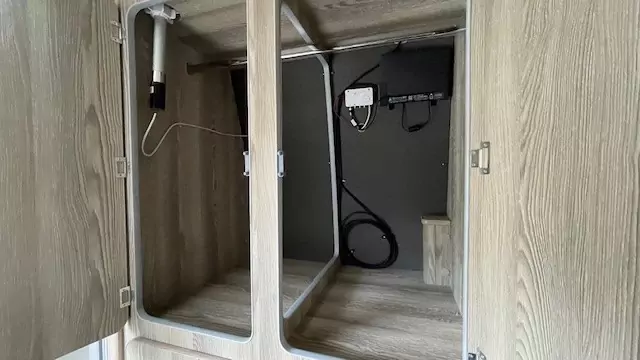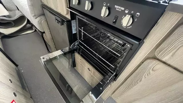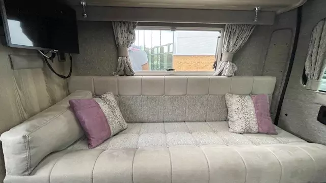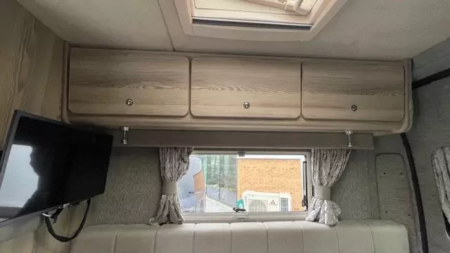 The well-appointed kitchen includes a hob, oven/grill, microwave, and sink, making meal preparation simple and efficient. A mid-ship washroom provides convenience with a tip-up basin, Thetford swivel cassette toilet, and a plastic-lined shower with tambour door, ensuring practical use of space without compromising on comfort.