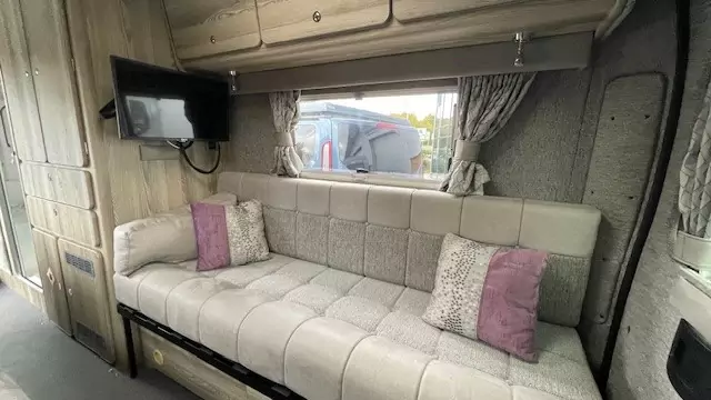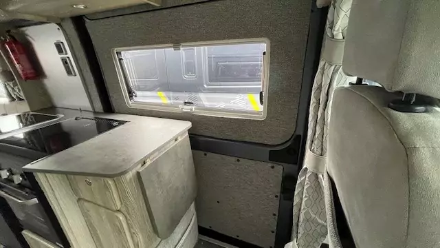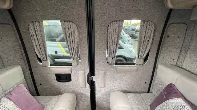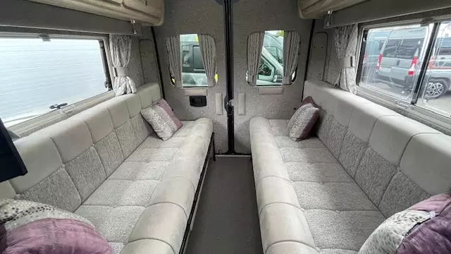 The spacious rear lounge features two comfortable settees that easily convert into either twin single beds or a large double bed, offering flexibility and comfort. The interior is hand-built using high-quality materials such as 15mm birch plywood, paired with premium upholstery for a warm, homely feel that sets it apart from mass-produced campervans.