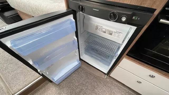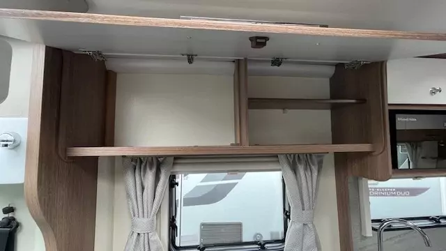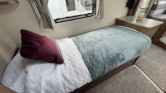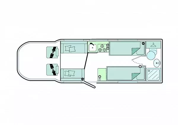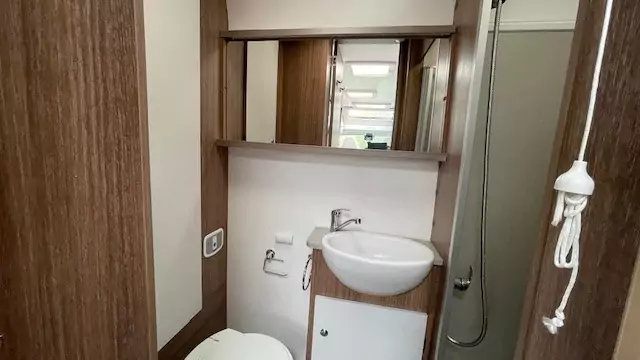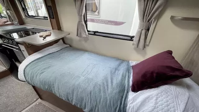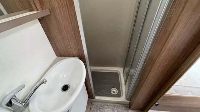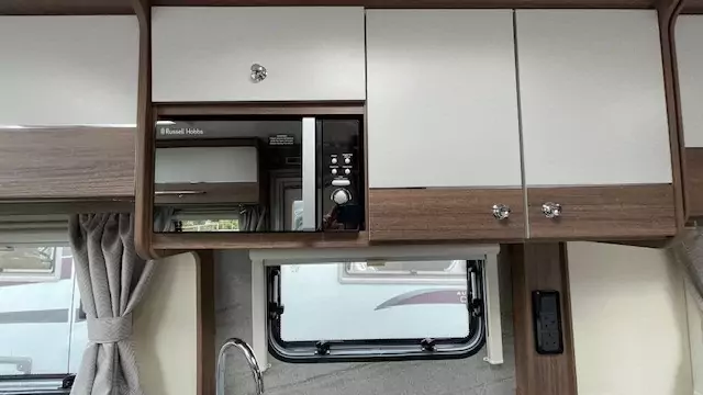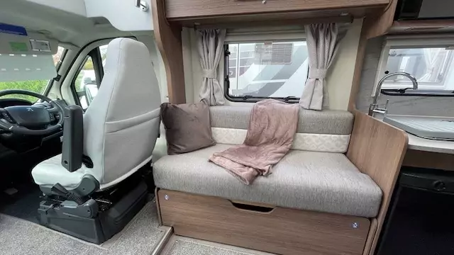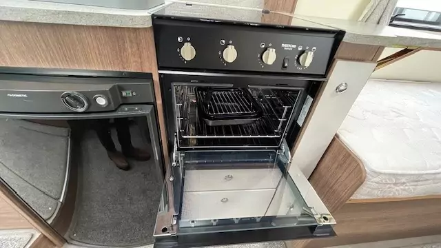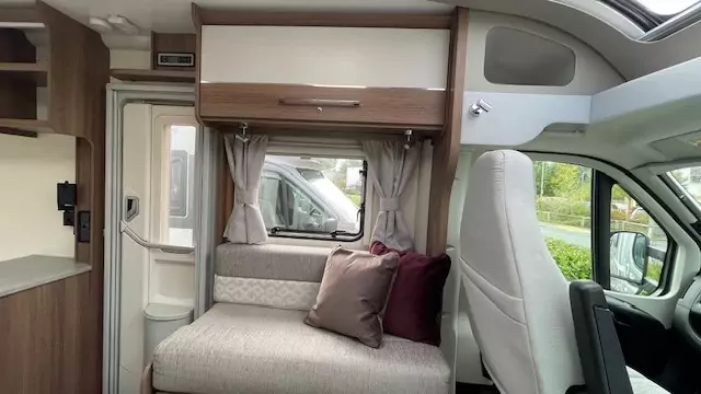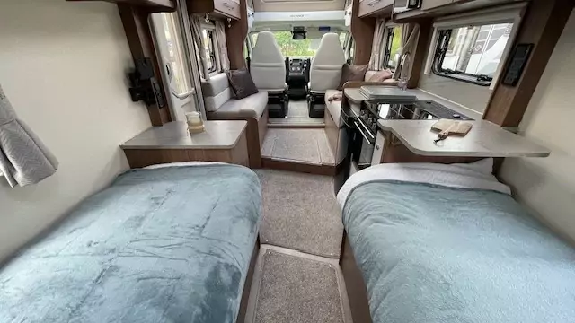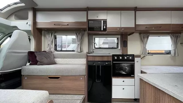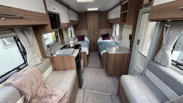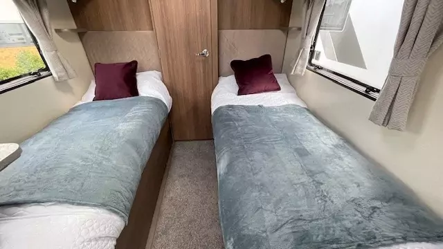 Inside, the layout includes two fixed single beds at the rear and a front lounge that converts into a double, making it ideal for couples or families. The well-equipped kitchen features a Thetford Triplex oven/grill, three-burner hob, Dometic fridge, and microwave, while the washroom offers a separate shower, toilet, and vanity unit. Comfort is assured with Truma Combi 4E heating and hot water, ambient lighting, and Bailey’s premium 'Finchley' soft furnishings.