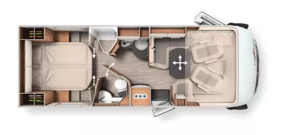 Inside, the C-Tourer I 150 QB features a rear end bedroom and a well-appointed living area with cabin carpets, habitation air conditioning, electric windows, and DC/DC charger for optimized power management. The practical kitchen includes a hob for convenient meal preparation, and the layout accommodates four passengers comfortably.