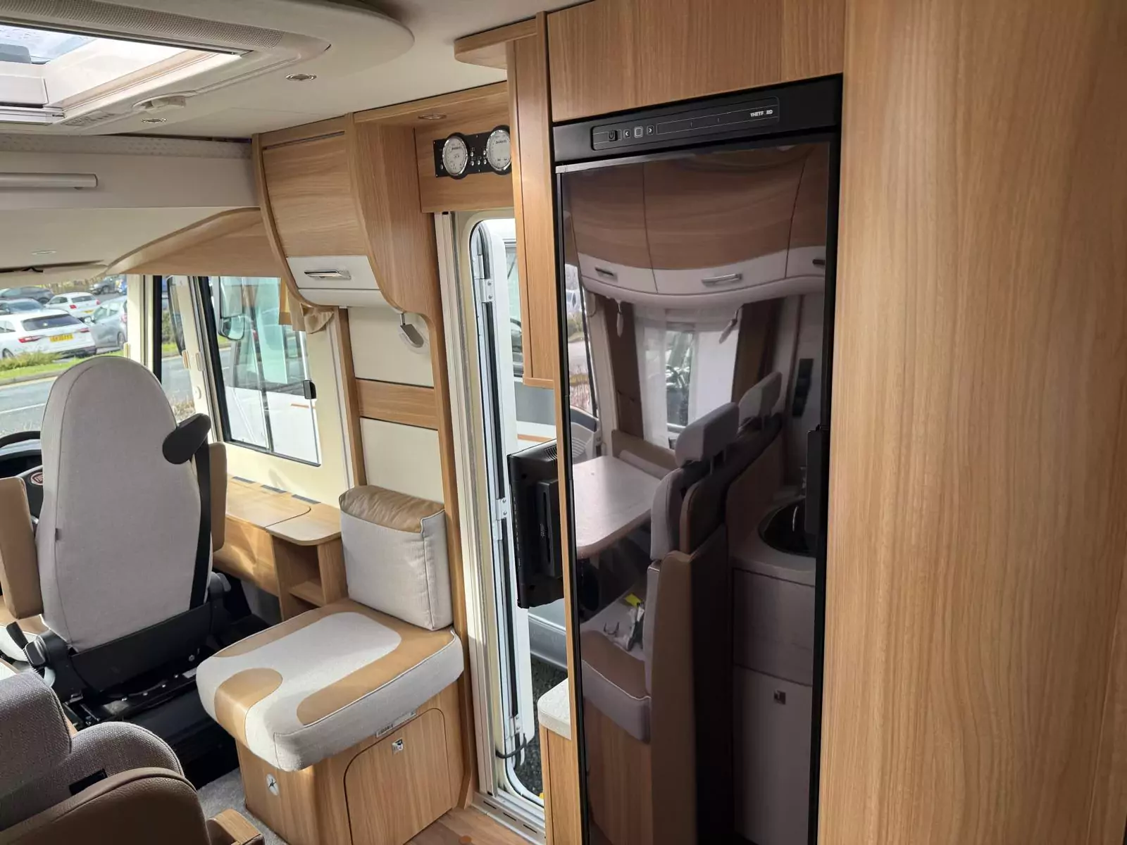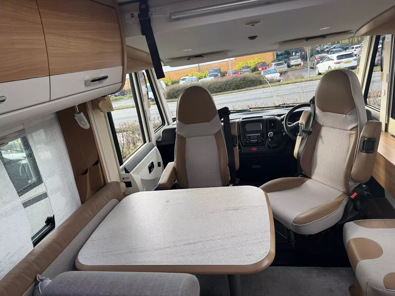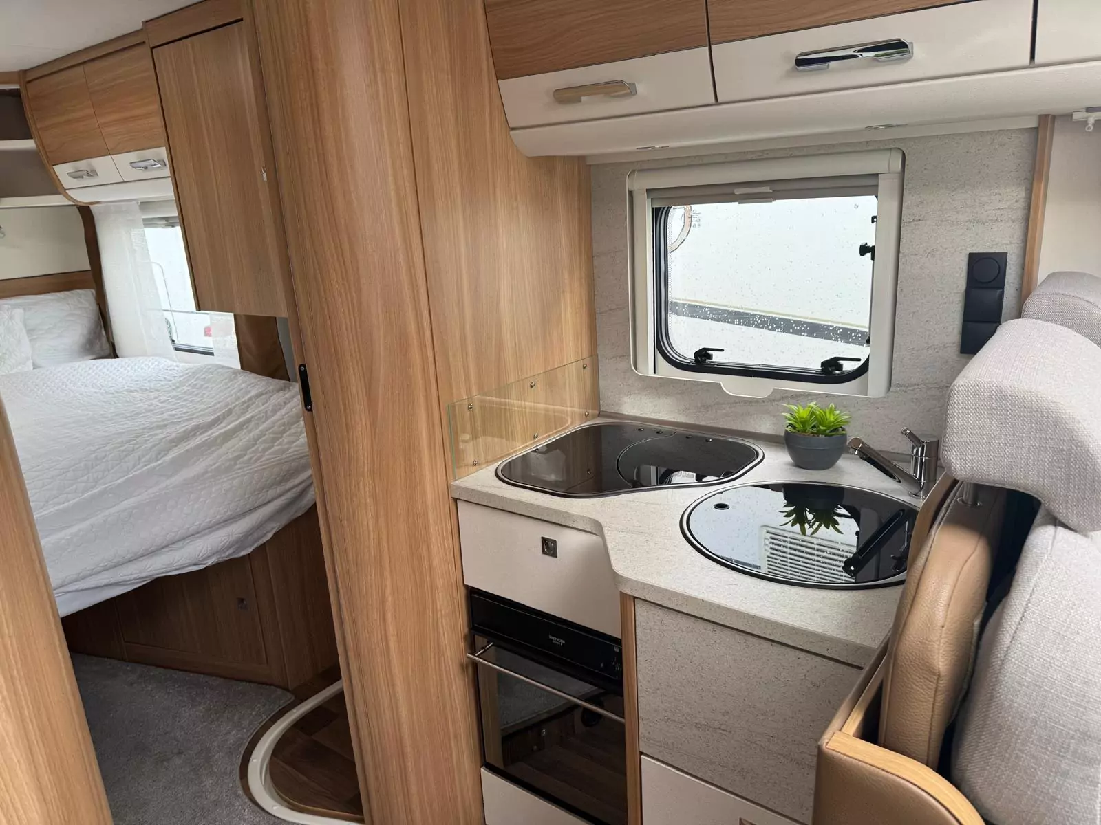 The interior offers a large fixed rear bed with toilet and separate shower, a drop down bed, allowing an amazing lounge area underneath, with plenty of storage, ready for those new adventures. This motorhome is bright and welcoming designed with versatility in mind. The fully equipped kitchen allows you to enjoy home-cooked meals wherever your journey takes you, complete with a hob, oven, and fridge/freezer, along with practical storage and workspace for everyday use. Comfortable, high-quality seating, multiple power sockets, and a television welcomes you so you are prepared for the road.