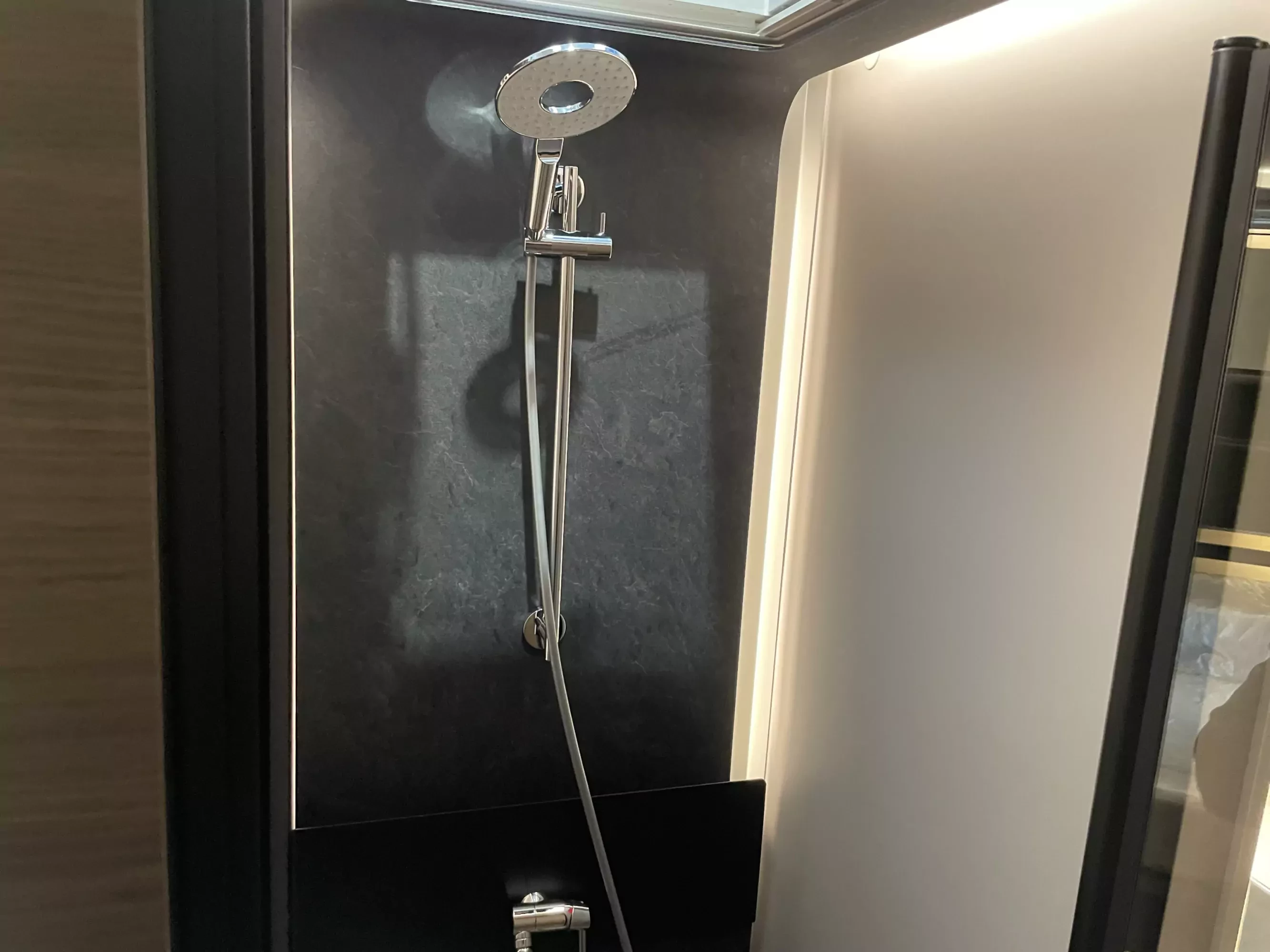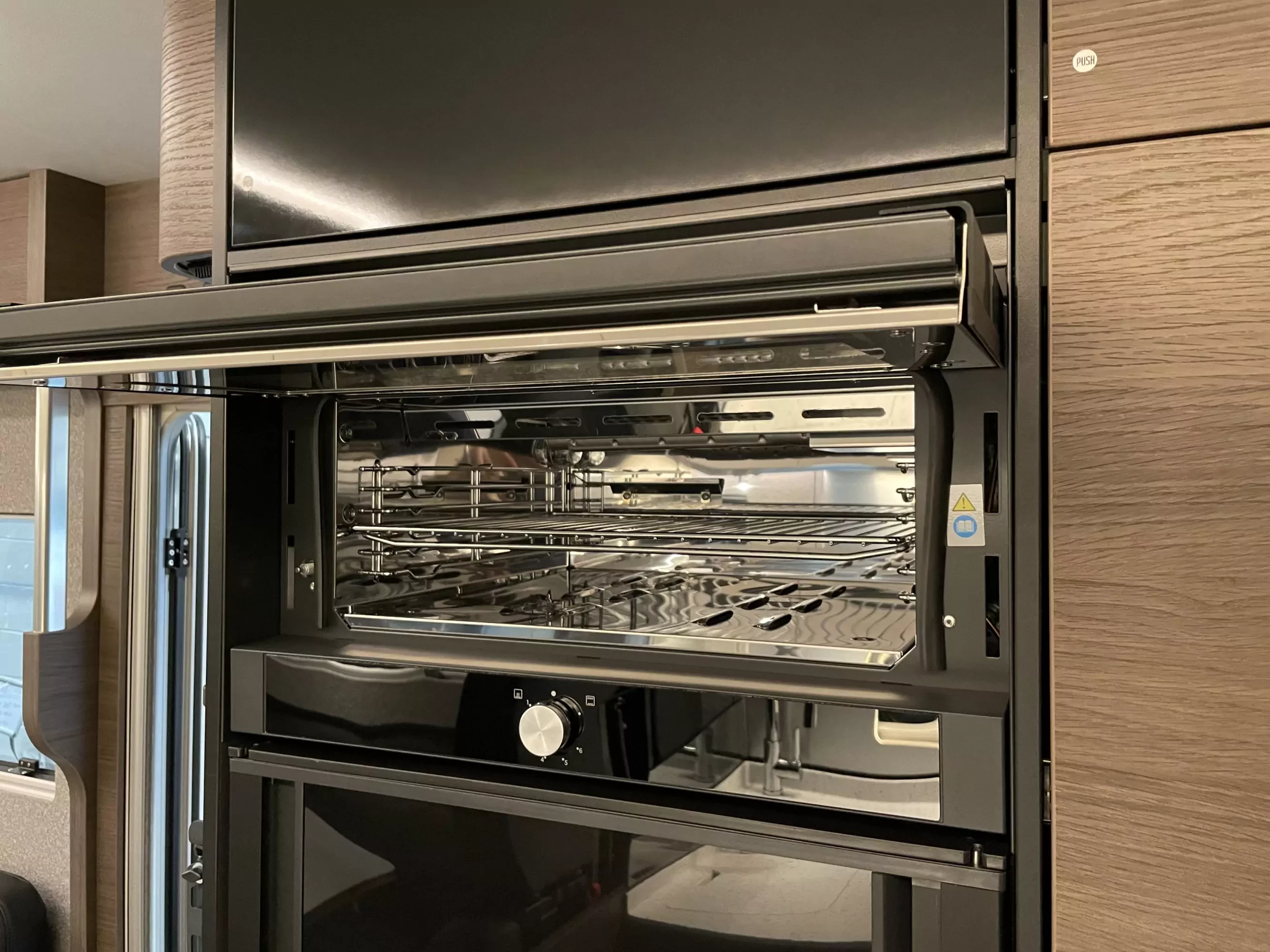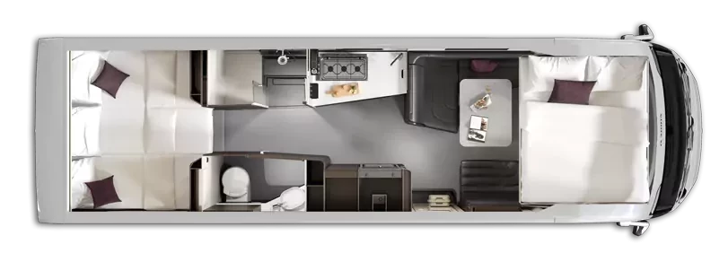 The kitchen is designed with practicality and style, featuring a hob, oven, grill, drainer, and premium Kerock plate surfaces. A large fridge, gas bottle storage for 2 × 11kg cylinders, and ample cupboards make longer journeys easy. Practical touches include cabin blinds, flyscreen, power sockets, USB ports, DC/DC converter, 2 × 100AH AGM auxiliary batteries, solar panels, and roof-mounted air conditioning. Safety and comfort are assured with Isofix seat fittings, electric parking brake, heated windscreen, reverse camera, and Alde/engine heat exchanger.