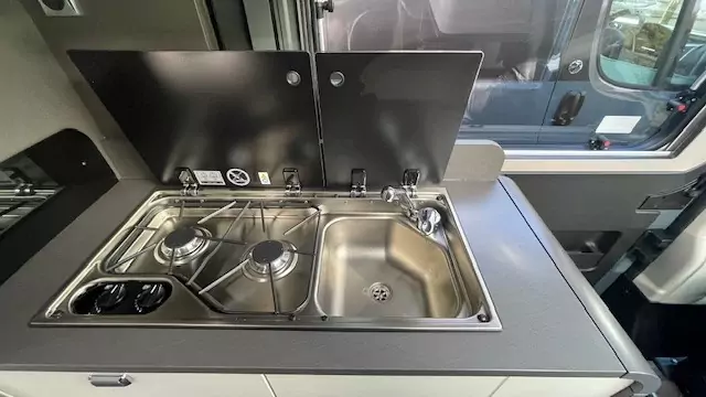 Inside, the end lounge and end bedroom layout creates a spacious and versatile living area. The lounge easily converts into a comfortable double bed with a Duvalay Alto mattress for superior sleeping comfort. Ambient LED lighting adds a modern, relaxing feel, while a flyscreen for the sliding door keeps fresh air in and bugs out. The fully equipped kitchen includes a hob, grill, and oven, with 230V and 12V power sockets, multiple USB points, and a BBQ connection. The Lounge Pack adds a 10-inch radio system, DAB radio, and Bluetooth connectivity for entertainment on the move.