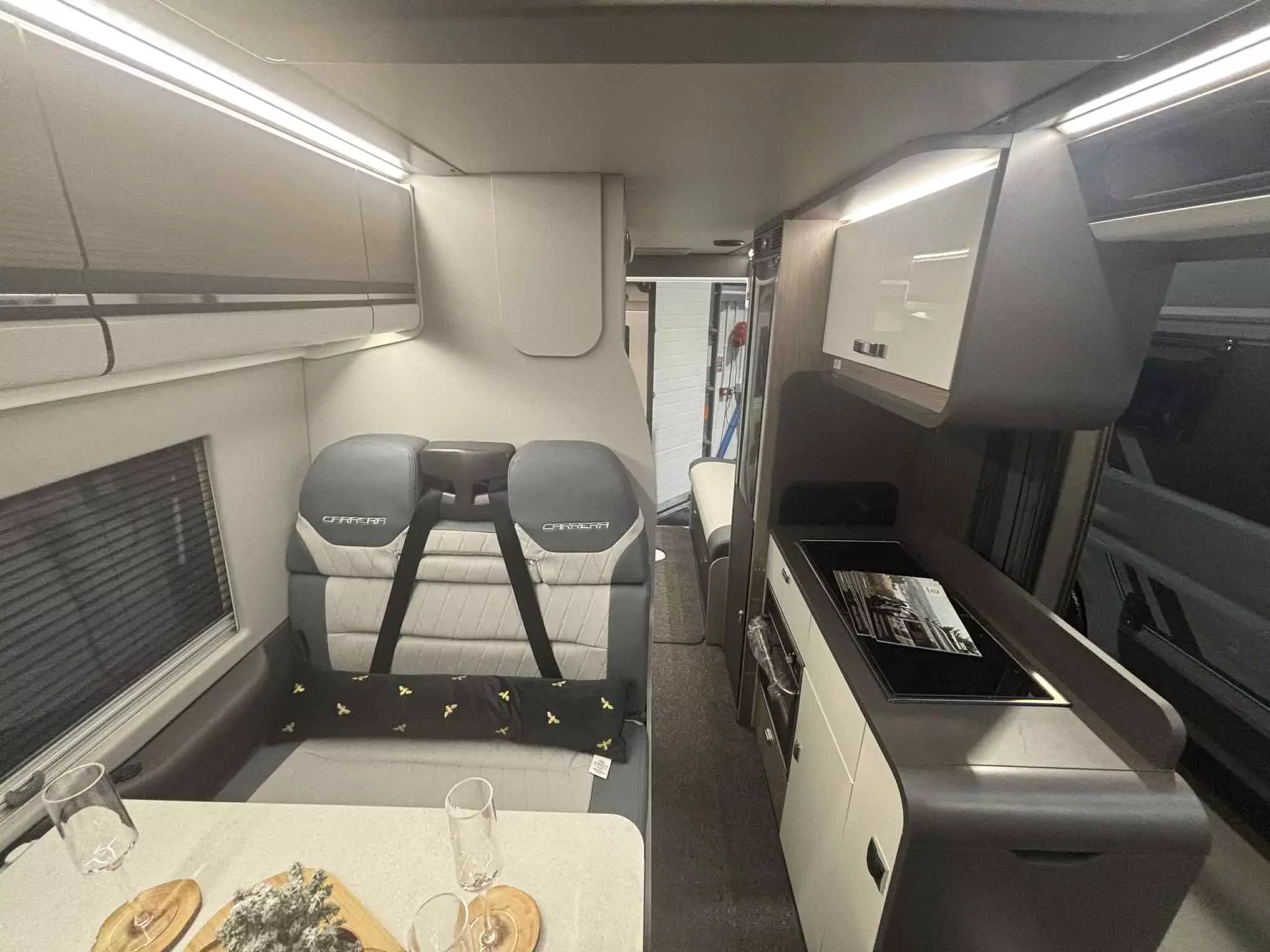 Inside, the Carrera 244 features an end lounge and end bedroom layout with double beds, including a pop-top roof bed for additional sleeping space. Ambient LED lighting creates a relaxing atmosphere, while flyscreens on the sliding door keep fresh air in and insects out. The fully equipped kitchen includes a hob, grill, oven, BBQ point, 230V and 12V sockets, and multiple USB points. The Lounge Pack adds a 10-inch radio system, DAB radio, and Bluetooth connectivity for entertainment on the move.