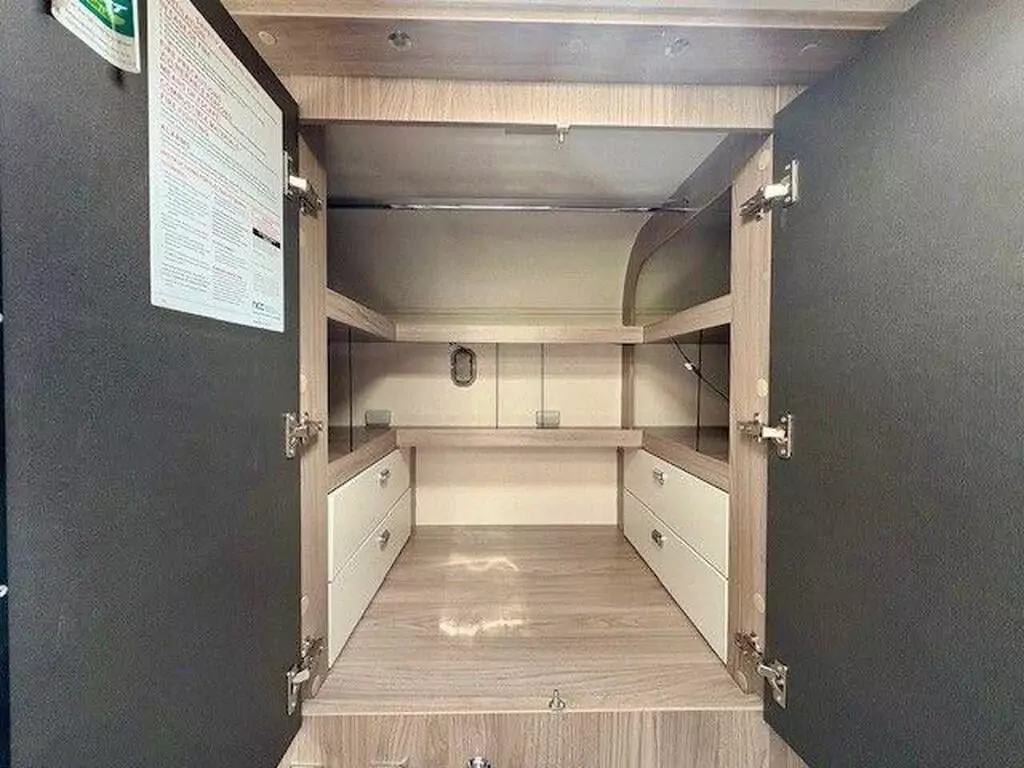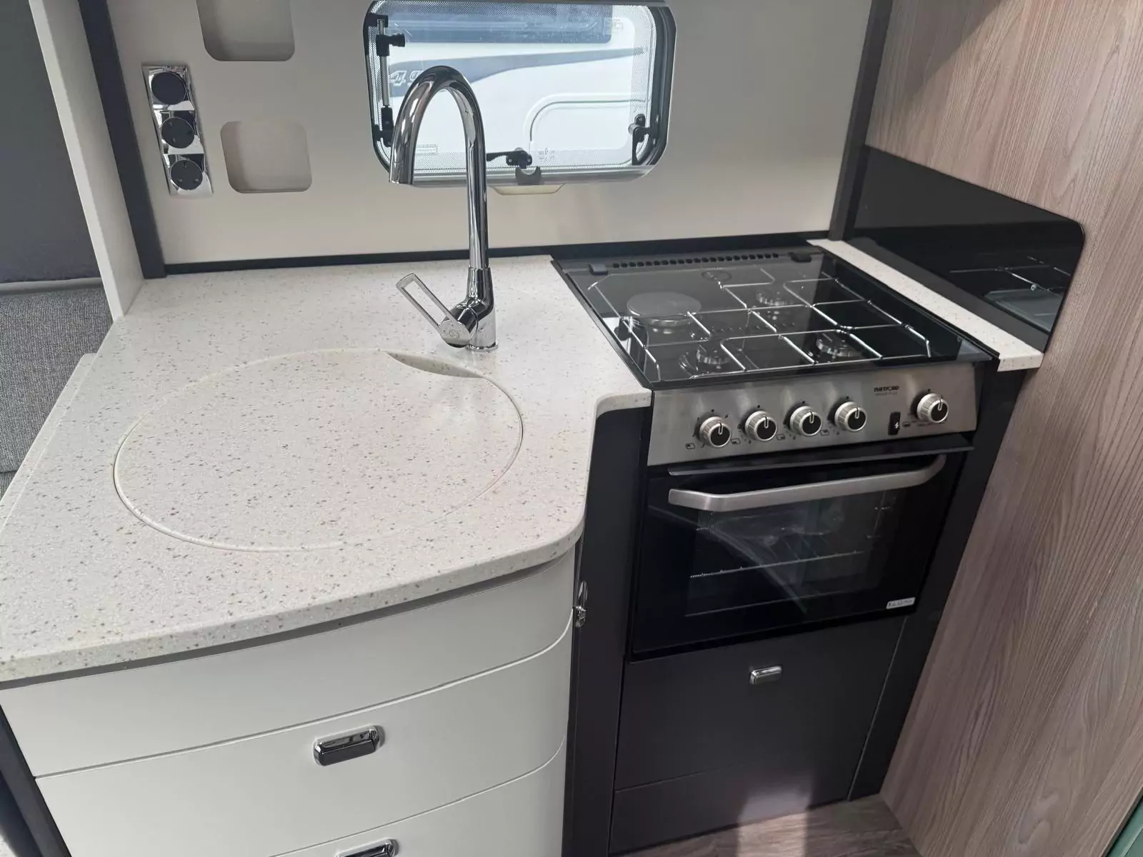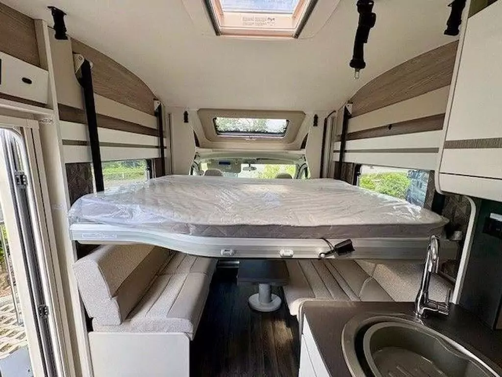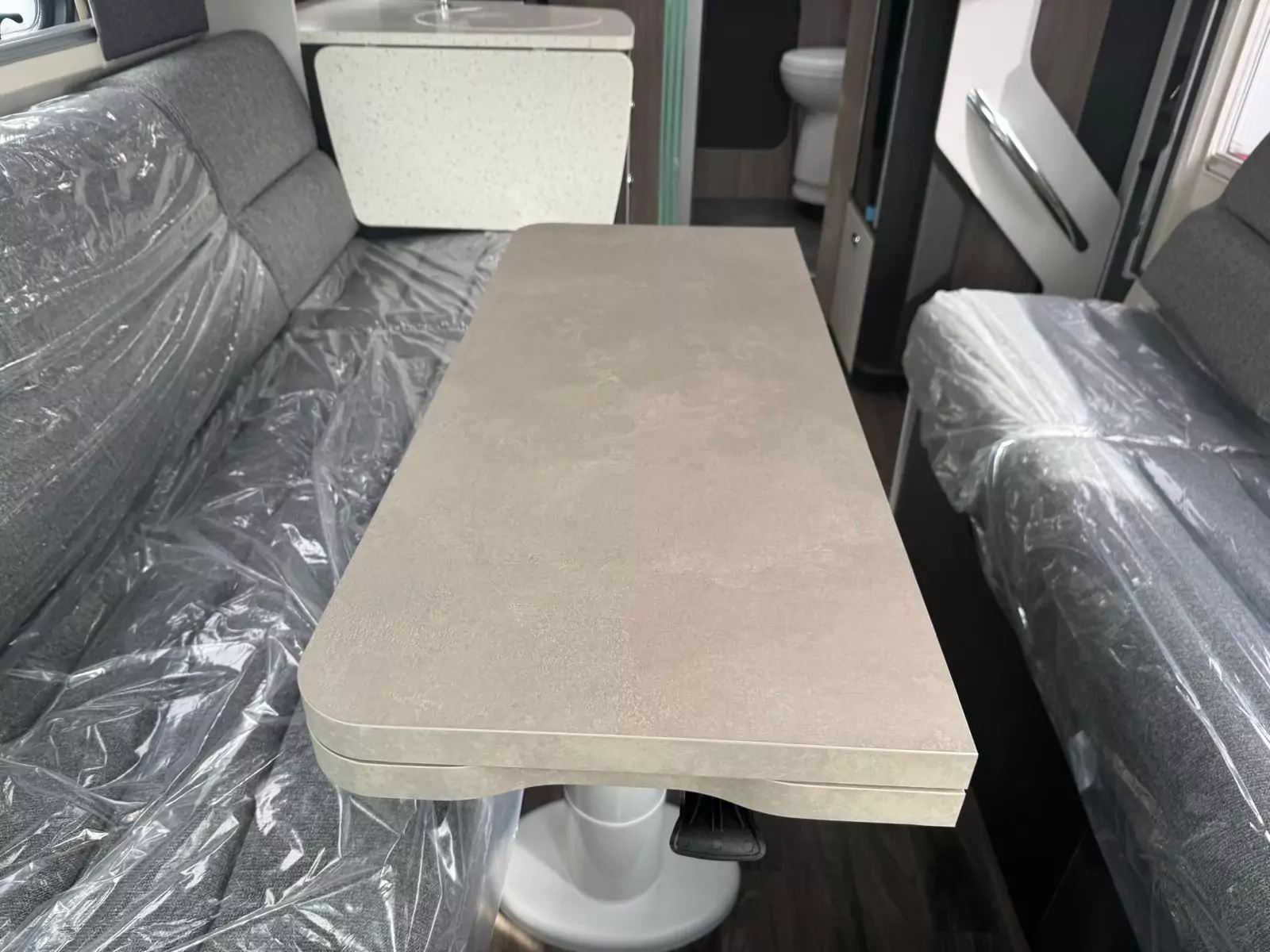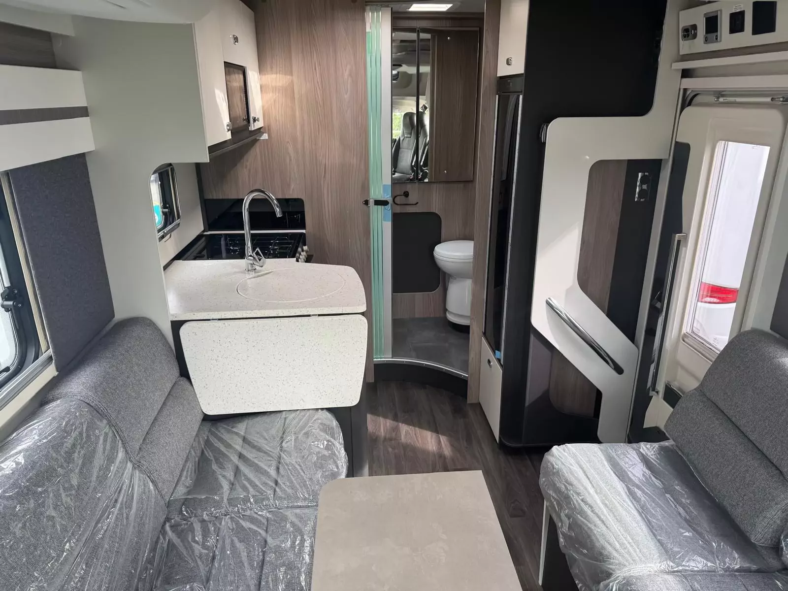The kitchen is fully equipped for life on the move, featuring a Thetford Triplex oven and grill, three-burner gas hob with electric hotplate, and a 133L tall slimline Dometic fridge with removable freezer compartment. Practical design touches include a new textured Grit Gres worktop, slim stainless steel sink, illuminated splashback, and extra worktop extensions for added prep space. Dining is equally versatile, thanks to front parallel lounge layouts with fold-down travelling seats and optional Mapa electric rise-and-fall tables.