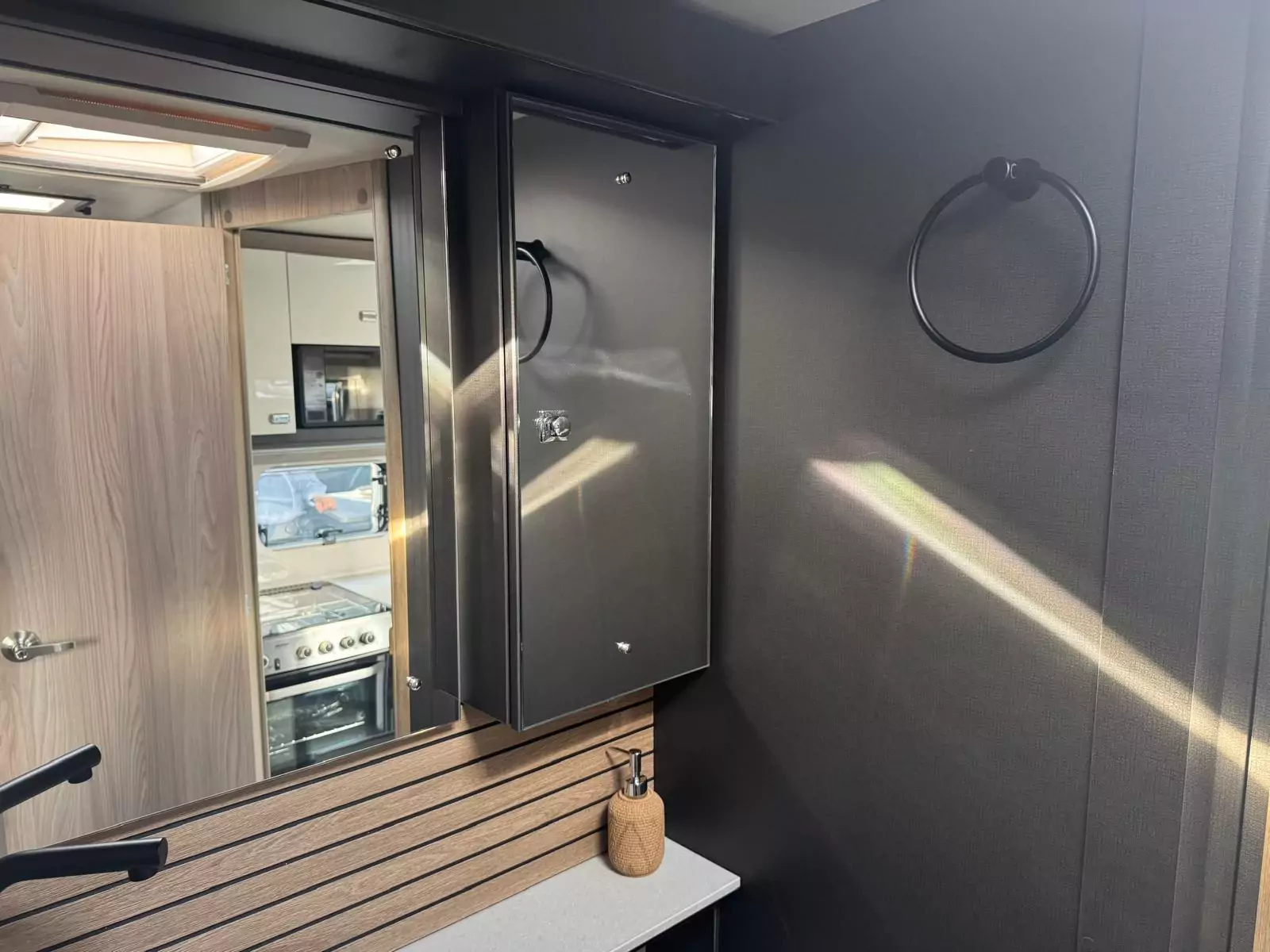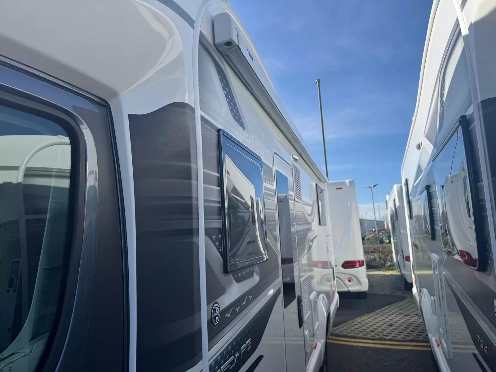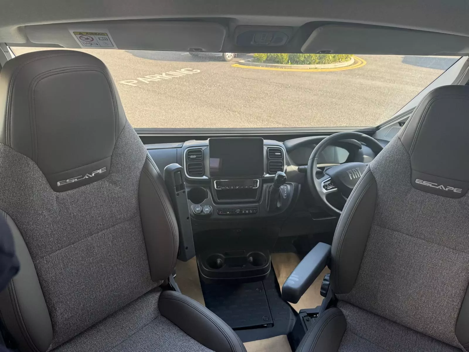 Inside, Escape combines style and practicality with a high 2110mm internal roof height, stylish Sangallo Elm woodgrain cabinetry, cream gloss lockers, and soft furnishings that are both stain resistant and easy to clean. Seating and sleeping arrangements are flexible, with Aguti travelling seats with ISOFix, Duvalay Duvalite Alto mattresses, drop-down beds, and clever storage solutions that maximise space. A boutique-style washroom with Ecocamel Jetstorm shower, illuminated panels, and smart fittings adds a touch of hotel-inspired luxury.
