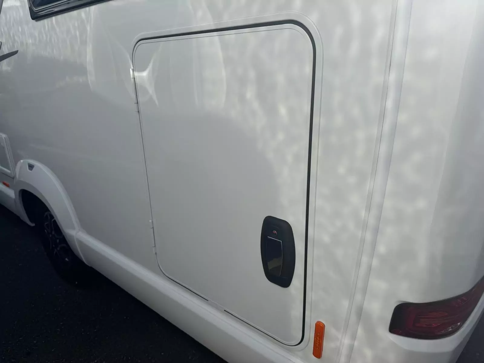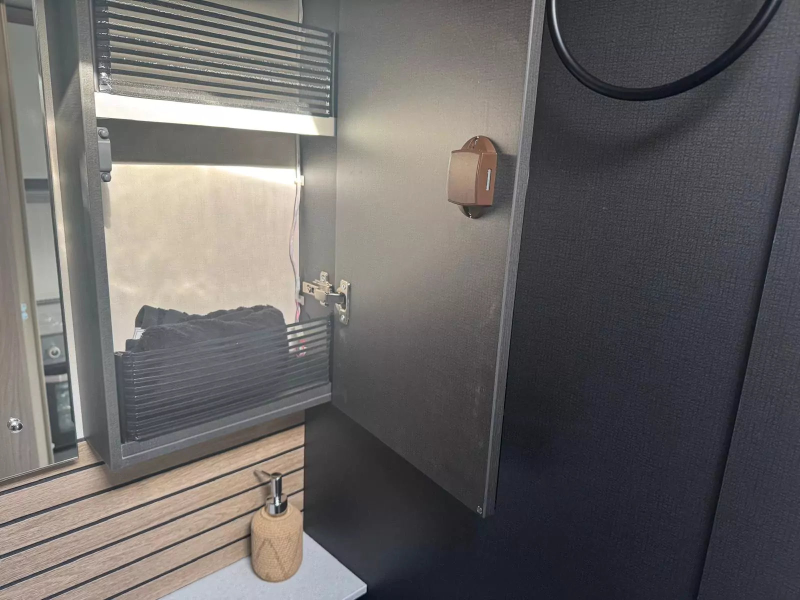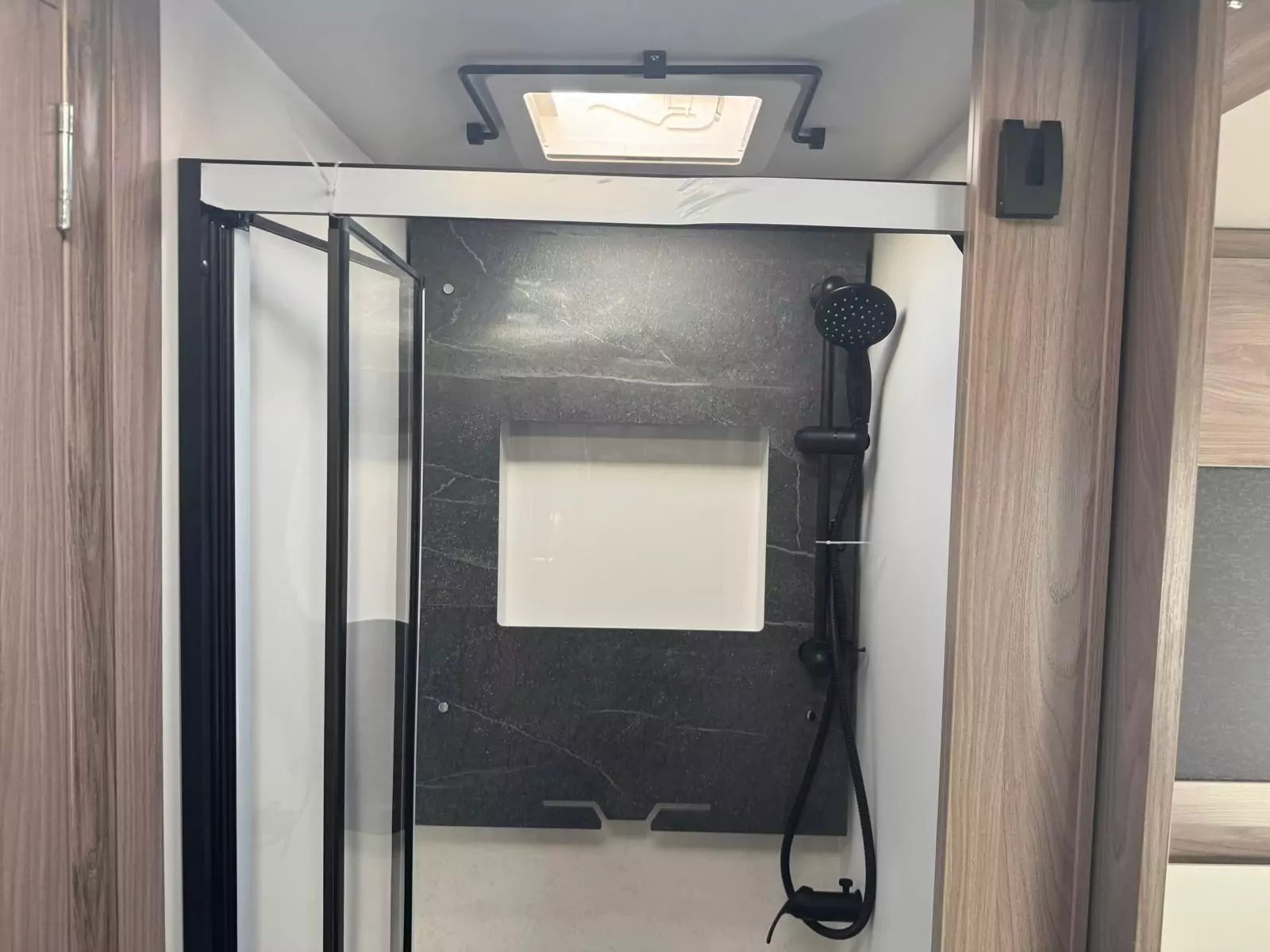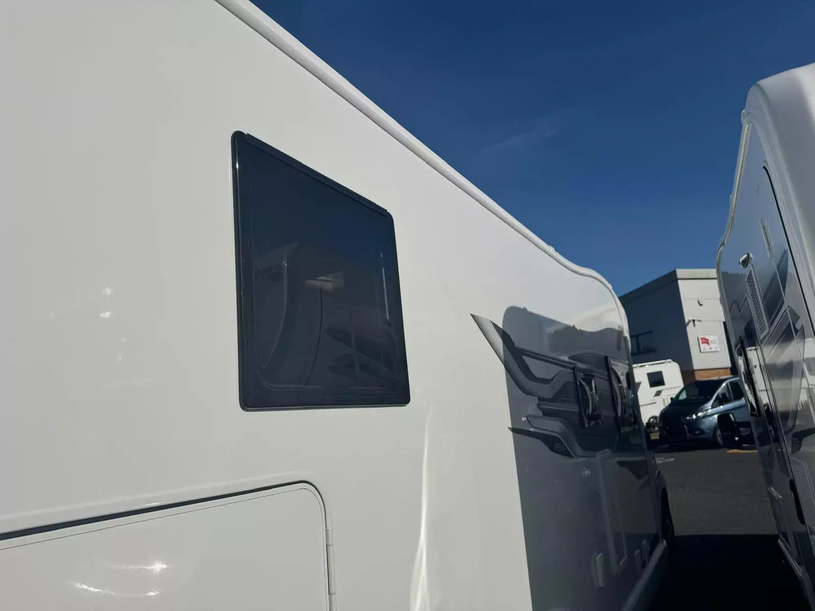 Inside, Escape combines style and practicality with a high 2110mm internal roof height, stylish Sangallo Elm woodgrain cabinetry, cream gloss lockers, and soft furnishings that are both stain resistant and easy to clean. Seating and sleeping arrangements are flexible, with Aguti travelling seats with ISOFix, Duvalay Duvalite Alto mattresses, drop-down beds, and clever storage solutions that maximise space. A boutique-style washroom with Ecocamel Jetstorm shower, illuminated panels, and smart fittings adds a touch of hotel-inspired luxury.