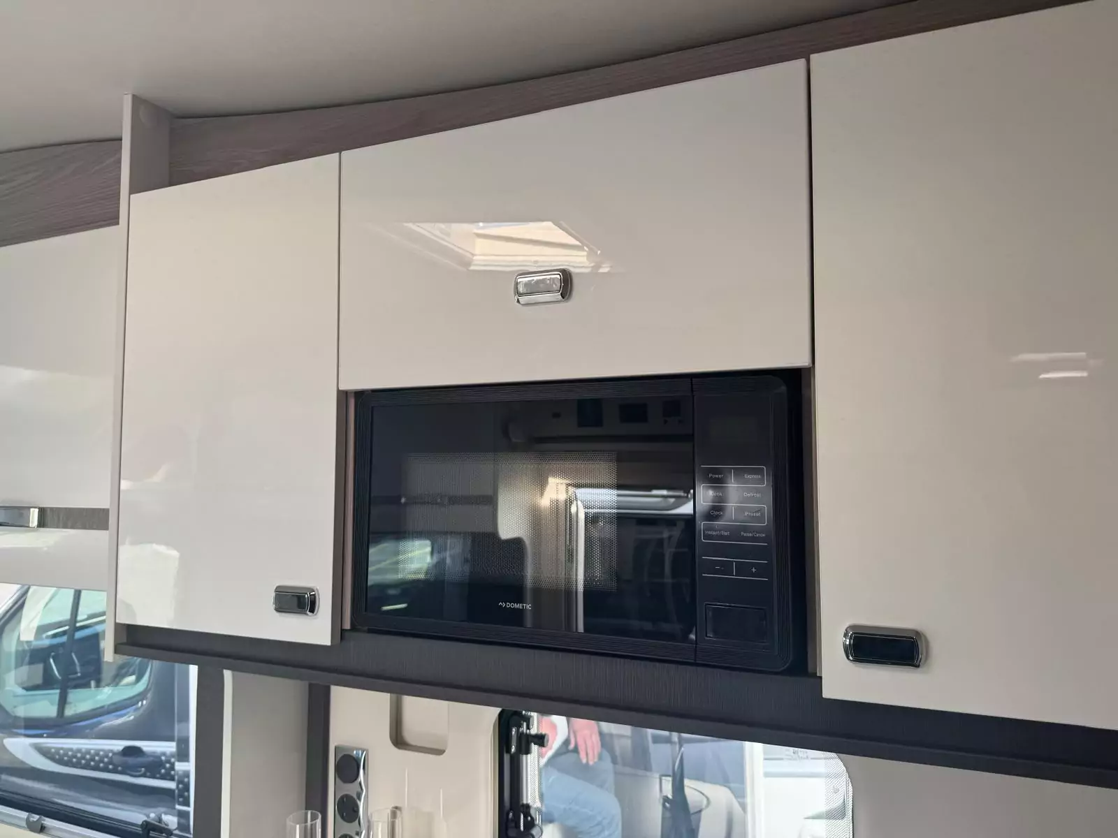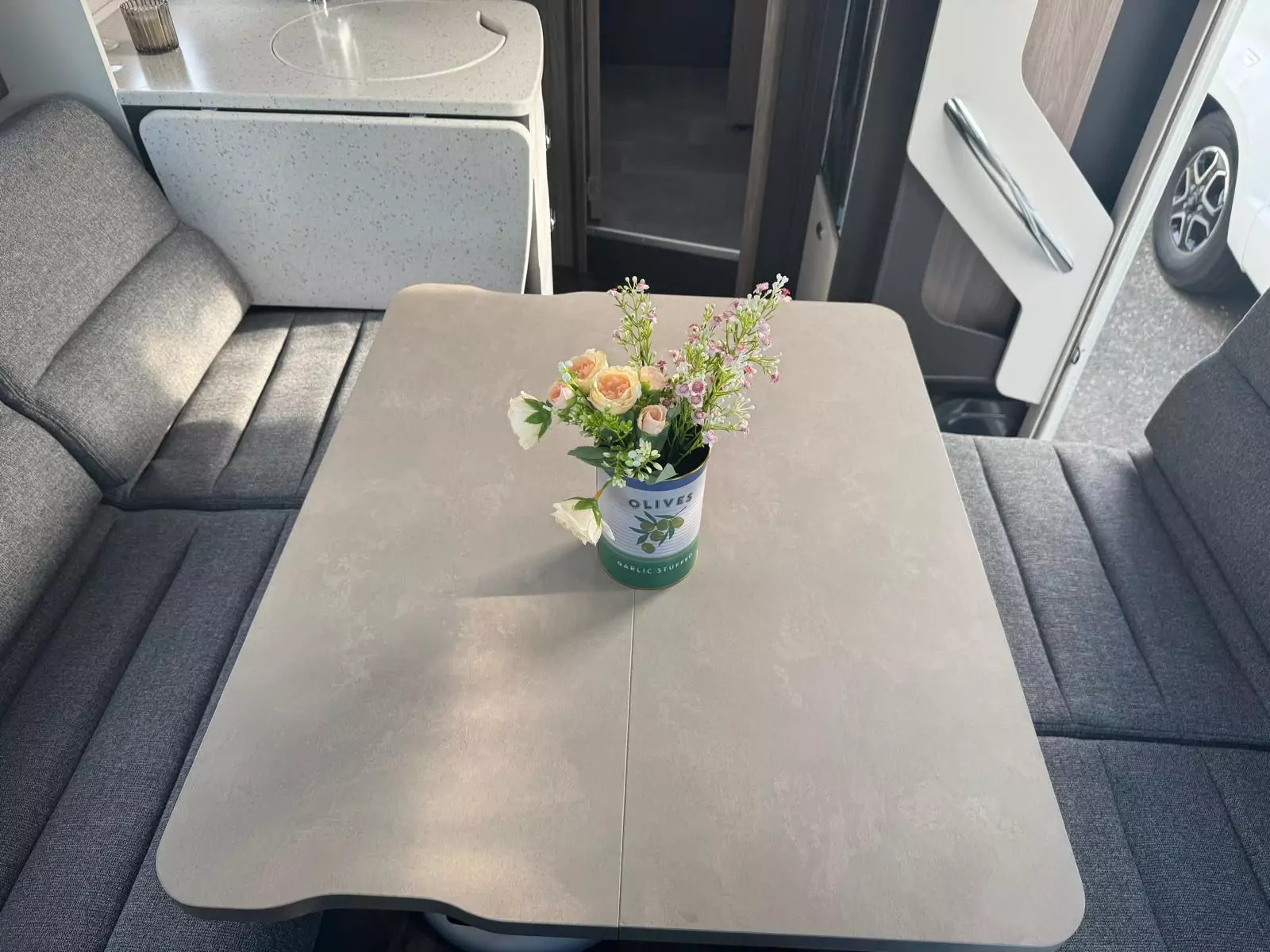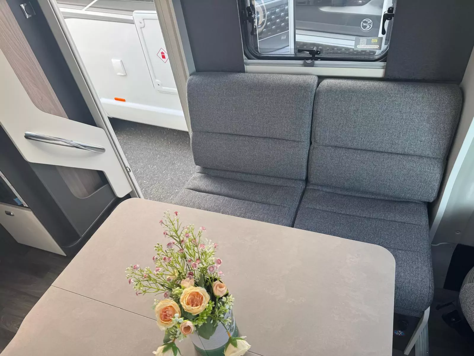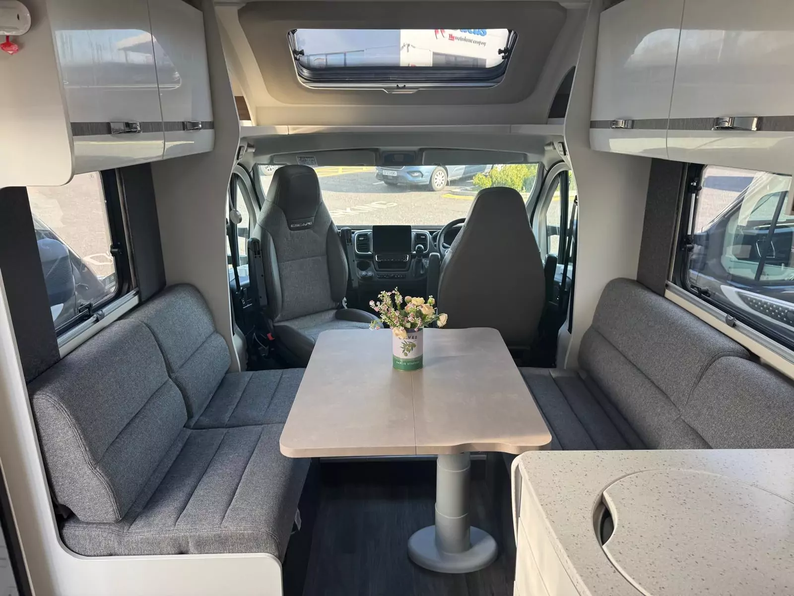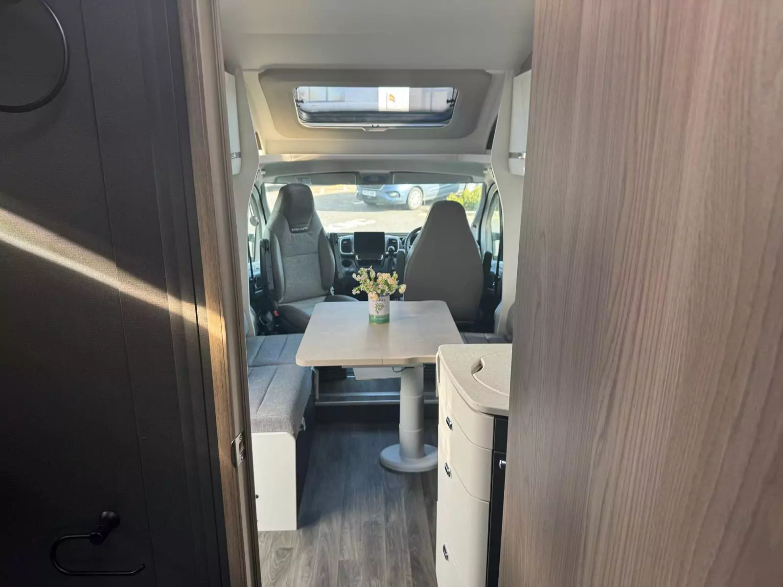 The kitchen is fully equipped for life on the move, featuring a Thetford Triplex oven and grill, three-burner gas hob with electric hotplate, and a 133L tall slimline Dometic fridge with removable freezer compartment. Practical design touches include a new textured Grit Gres worktop, slim stainless steel sink, illuminated splashback, and extra worktop extensions for added prep space. Dining is equally versatile, thanks to front parallel lounge layouts with fold-down travelling seats and optional Mapa electric rise-and-fall tables.