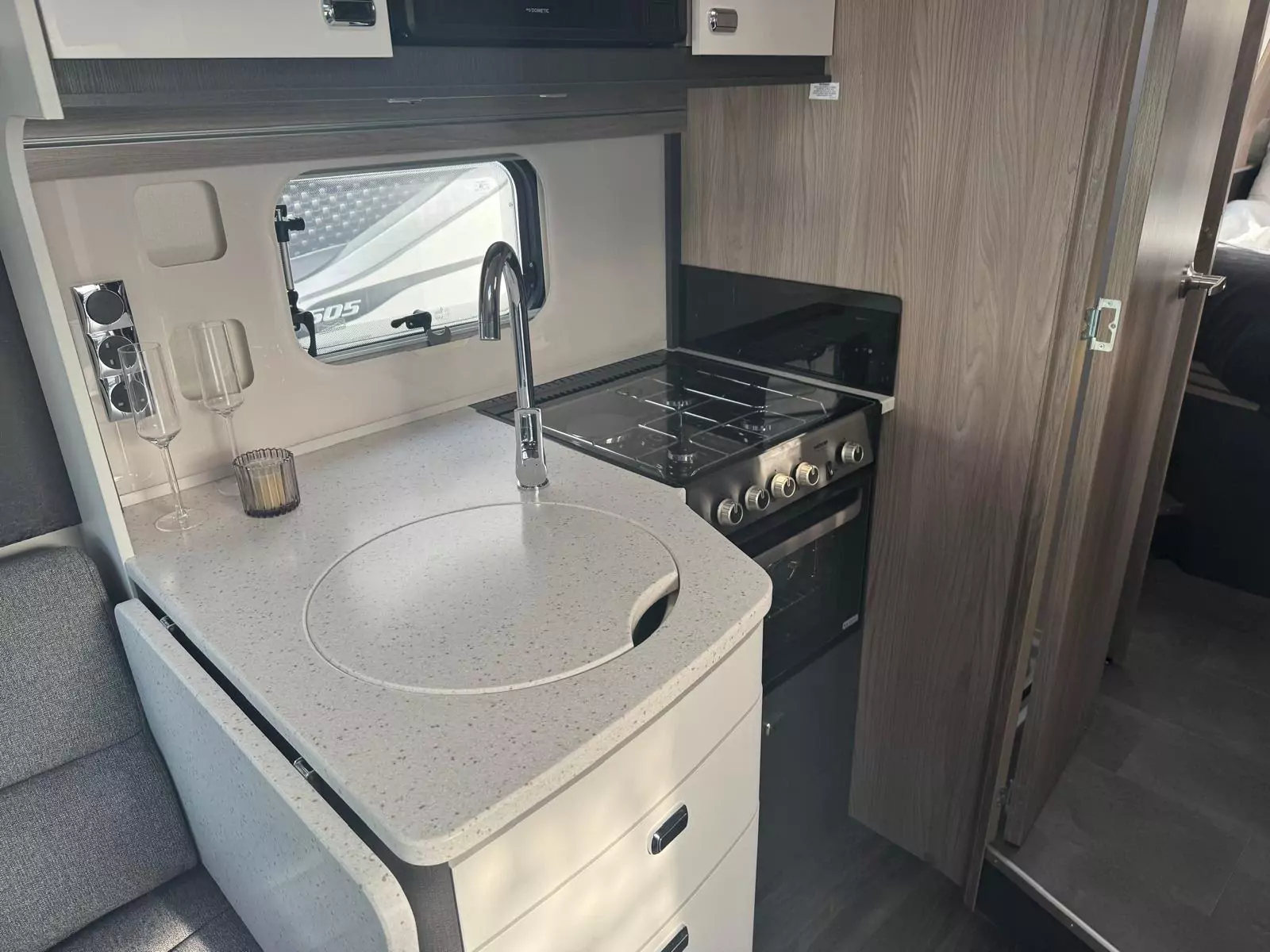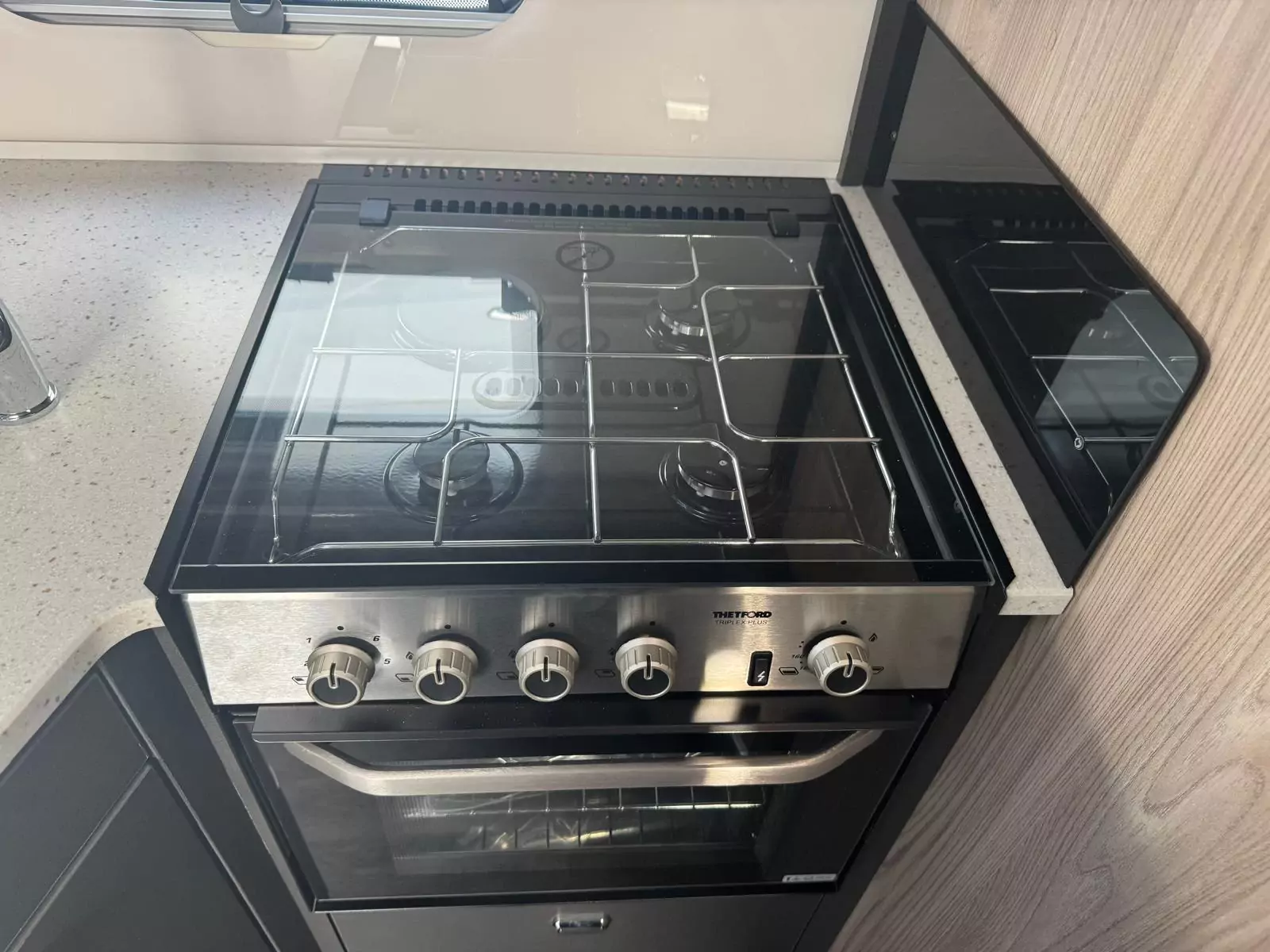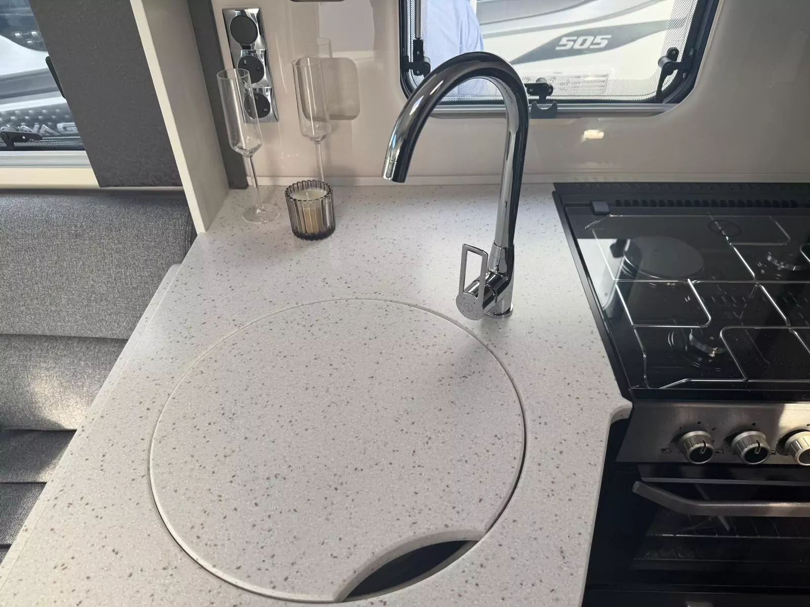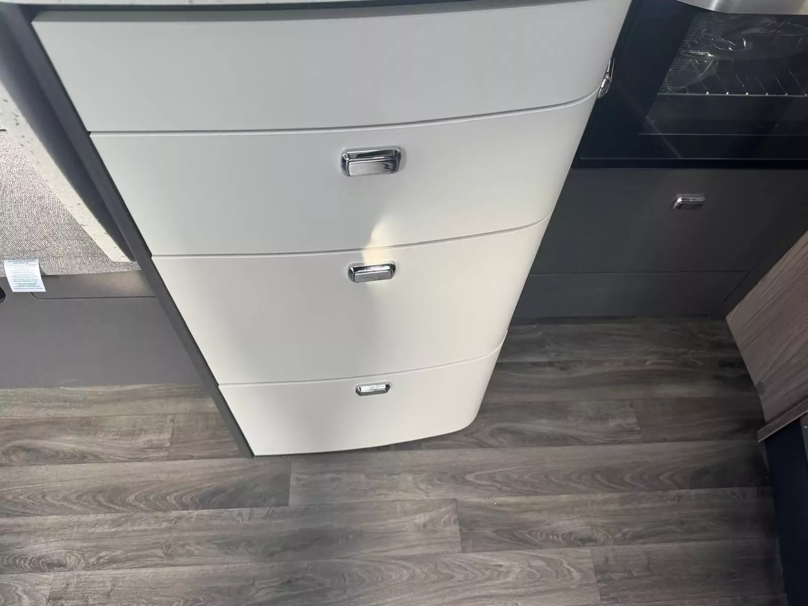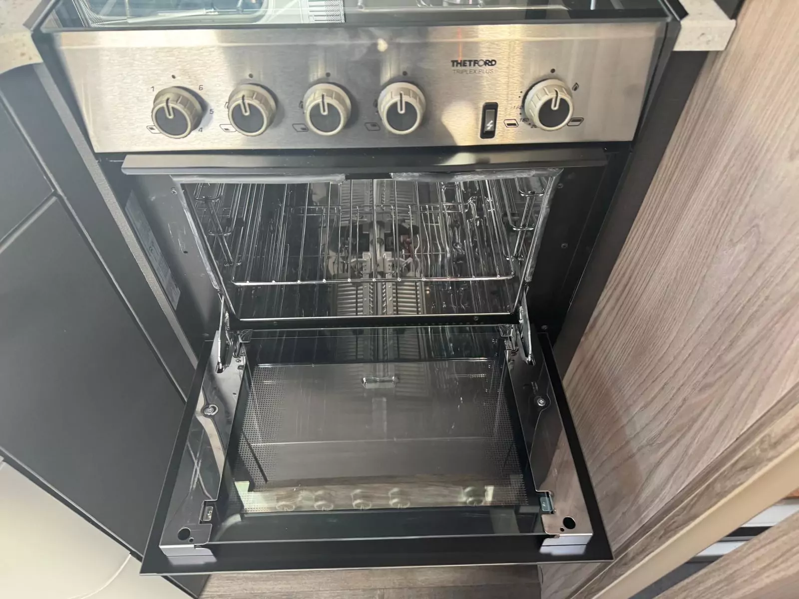 The kitchen is fully equipped for life on the move, featuring a Thetford Triplex oven and grill, three-burner gas hob with electric hotplate, and a 133L tall slimline Dometic fridge with removable freezer compartment. Practical design touches include a new textured Grit Gres worktop, slim stainless steel sink, illuminated splashback, and extra worktop extensions for added prep space. Dining is equally versatile, thanks to front parallel lounge layouts with fold-down travelling seats and optional Mapa electric rise-and-fall tables.