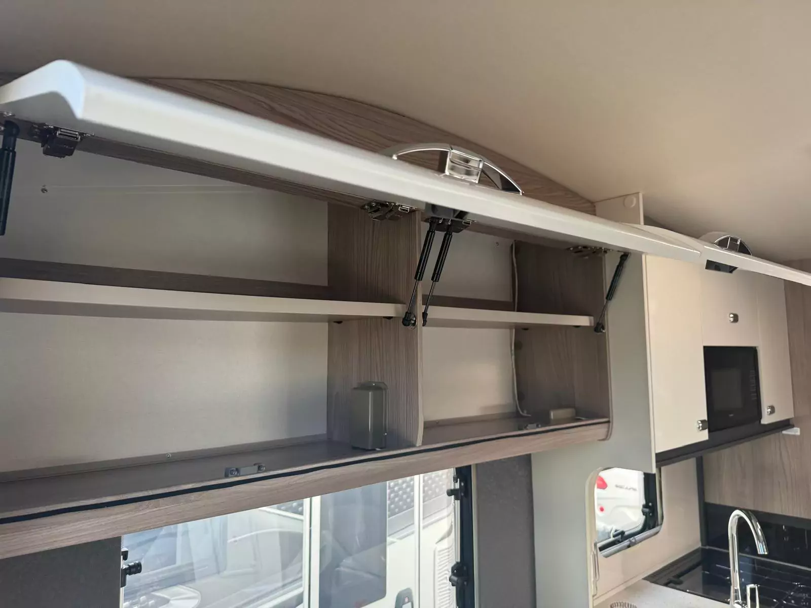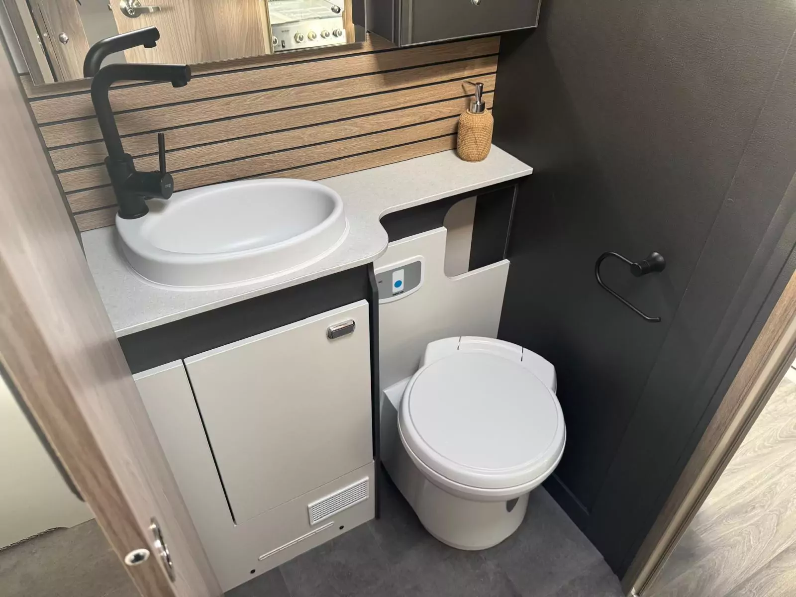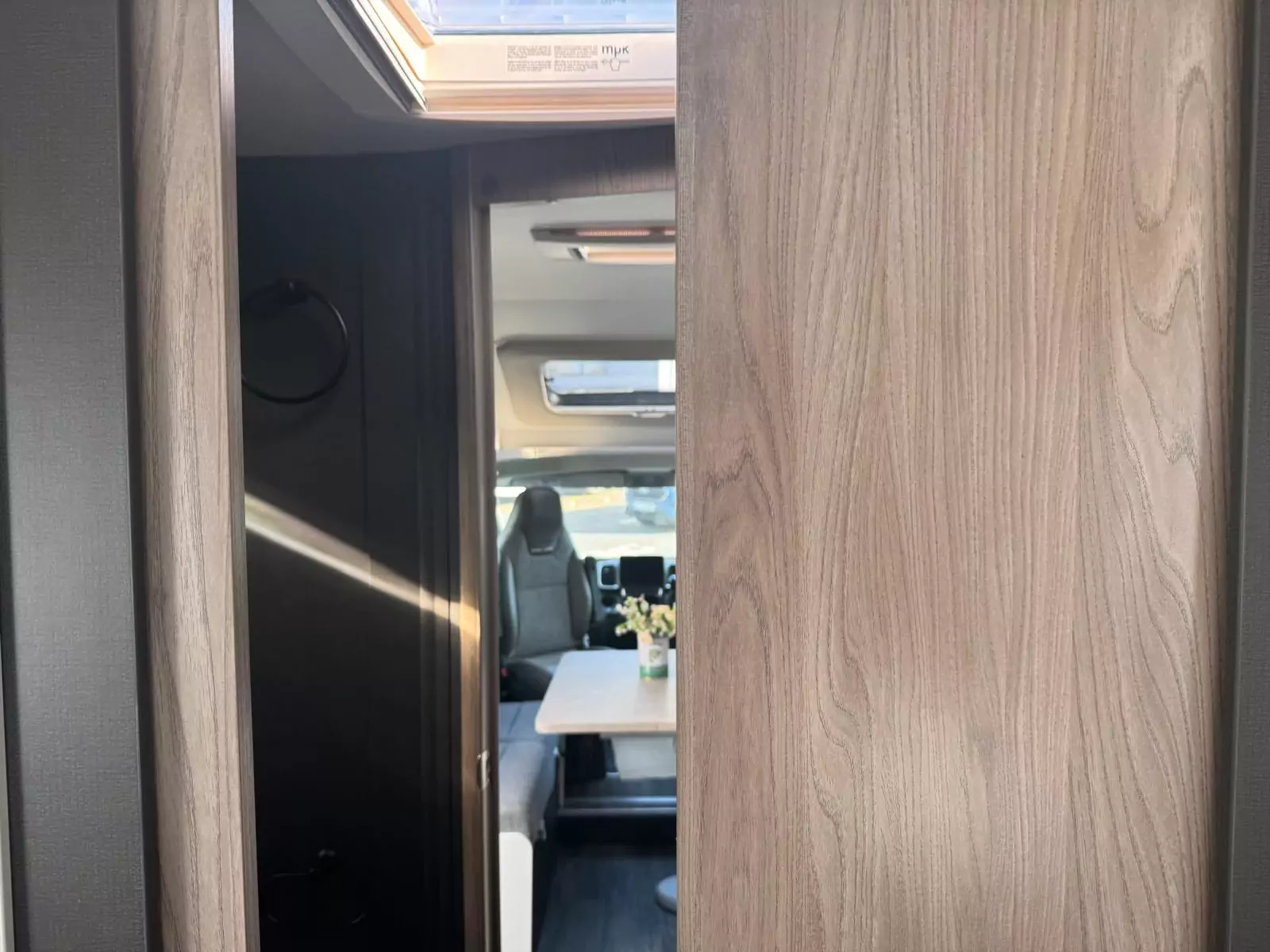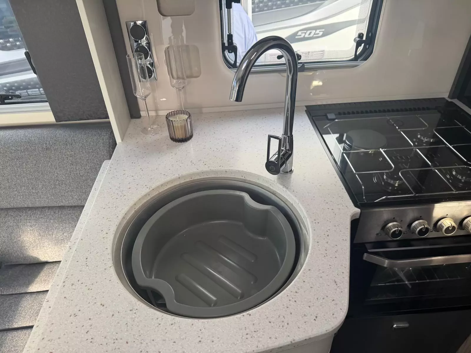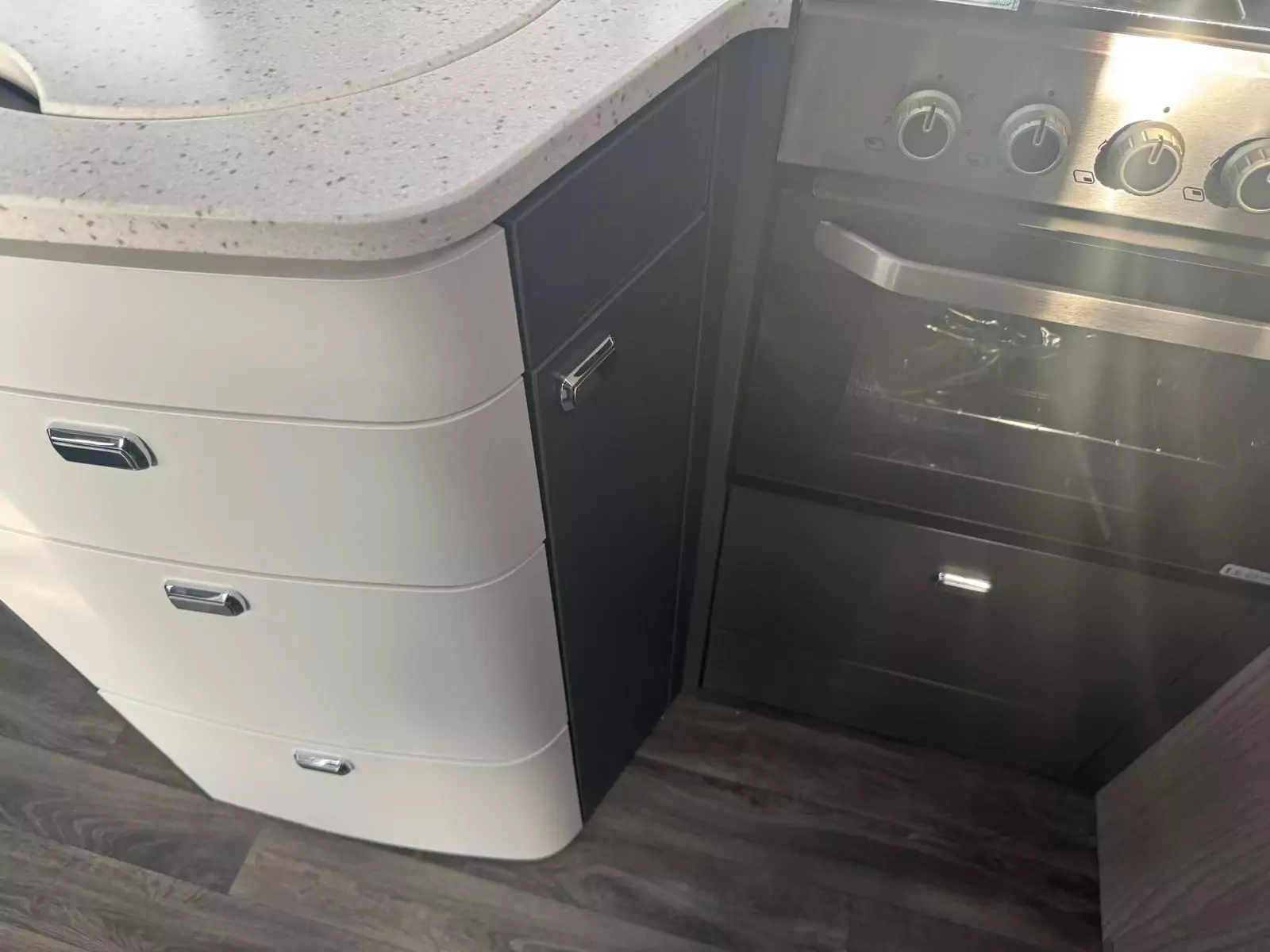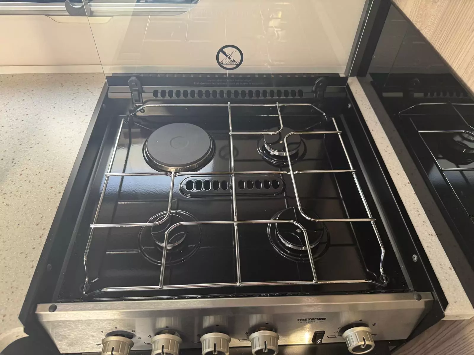 The kitchen is fully equipped for life on the move, featuring a Thetford Triplex oven and grill, three-burner gas hob with electric hotplate, and a 133L tall slimline Dometic fridge with removable freezer compartment. Practical design touches include a new textured Grit Gres worktop, slim stainless steel sink, illuminated splashback, and extra worktop extensions for added prep space. Dining is equally versatile, thanks to front parallel lounge layouts with fold-down travelling seats and optional Mapa electric rise-and-fall tables.