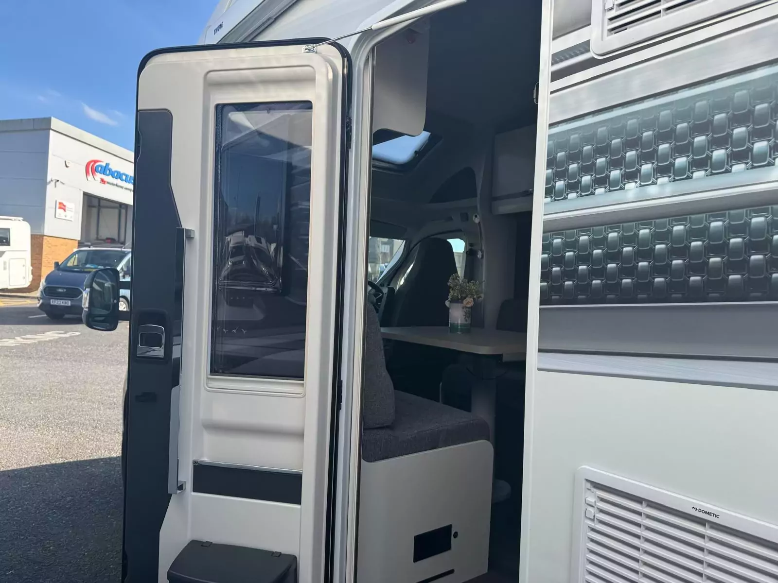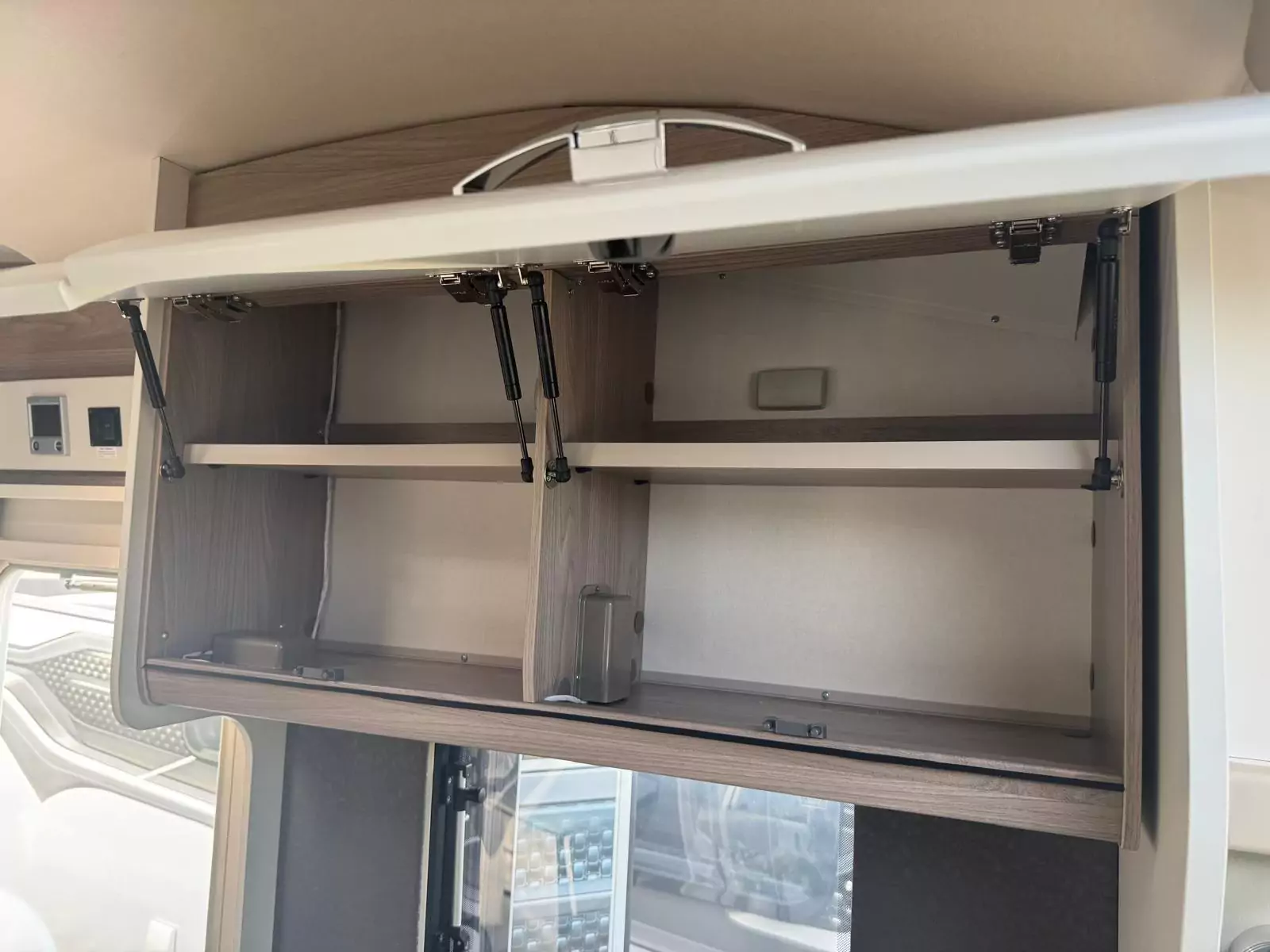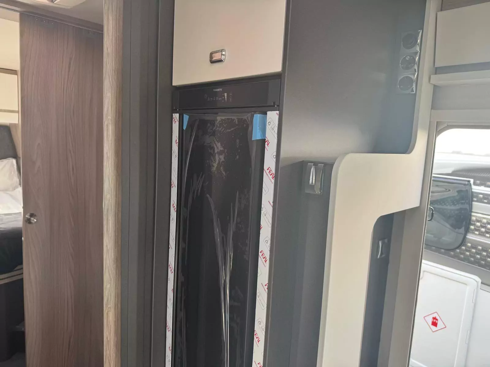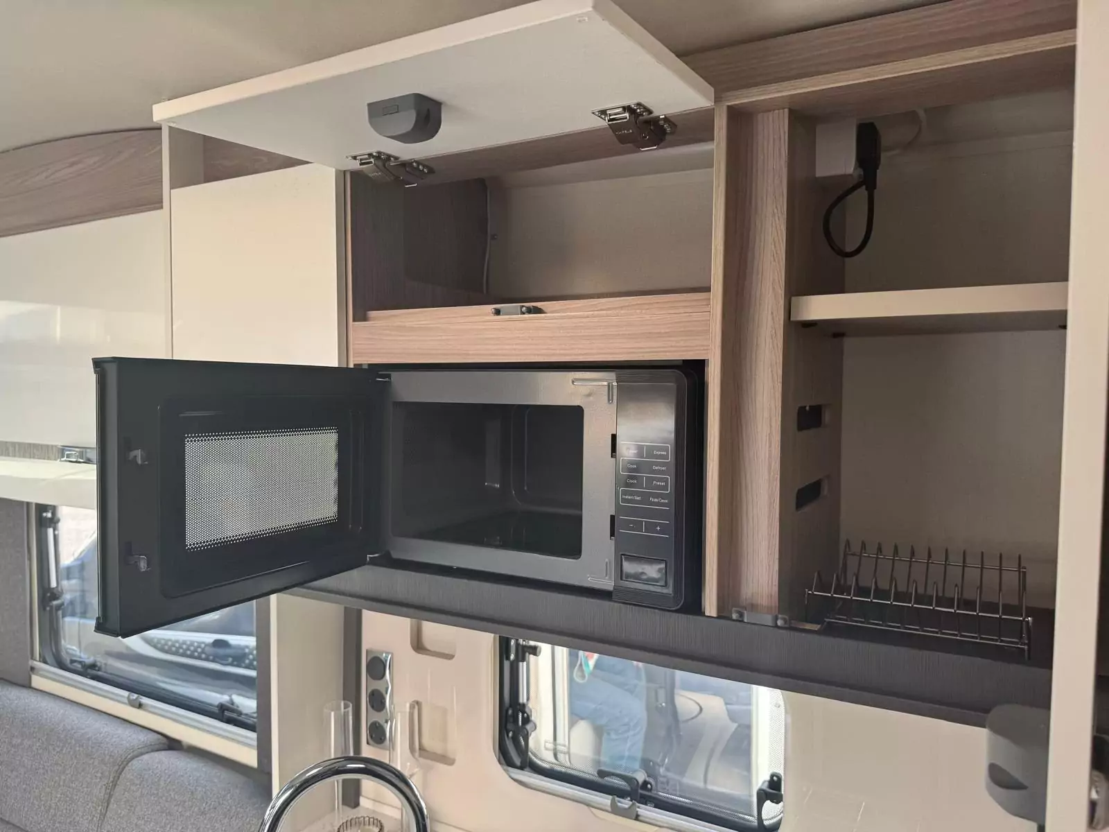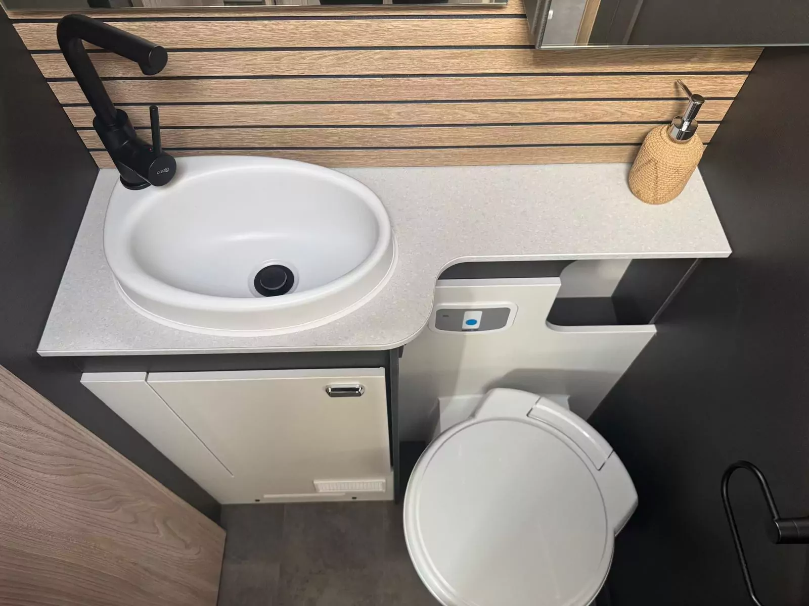 The kitchen is fully equipped for life on the move, featuring a Thetford Triplex oven and grill, three-burner gas hob with electric hotplate, and a 133L tall slimline Dometic fridge with removable freezer compartment. Practical design touches include a new textured Grit Gres worktop, slim stainless steel sink, illuminated splashback, and extra worktop extensions for added prep space. Dining is equally versatile, thanks to front parallel lounge layouts with fold-down travelling seats and optional Mapa electric rise-and-fall tables.
