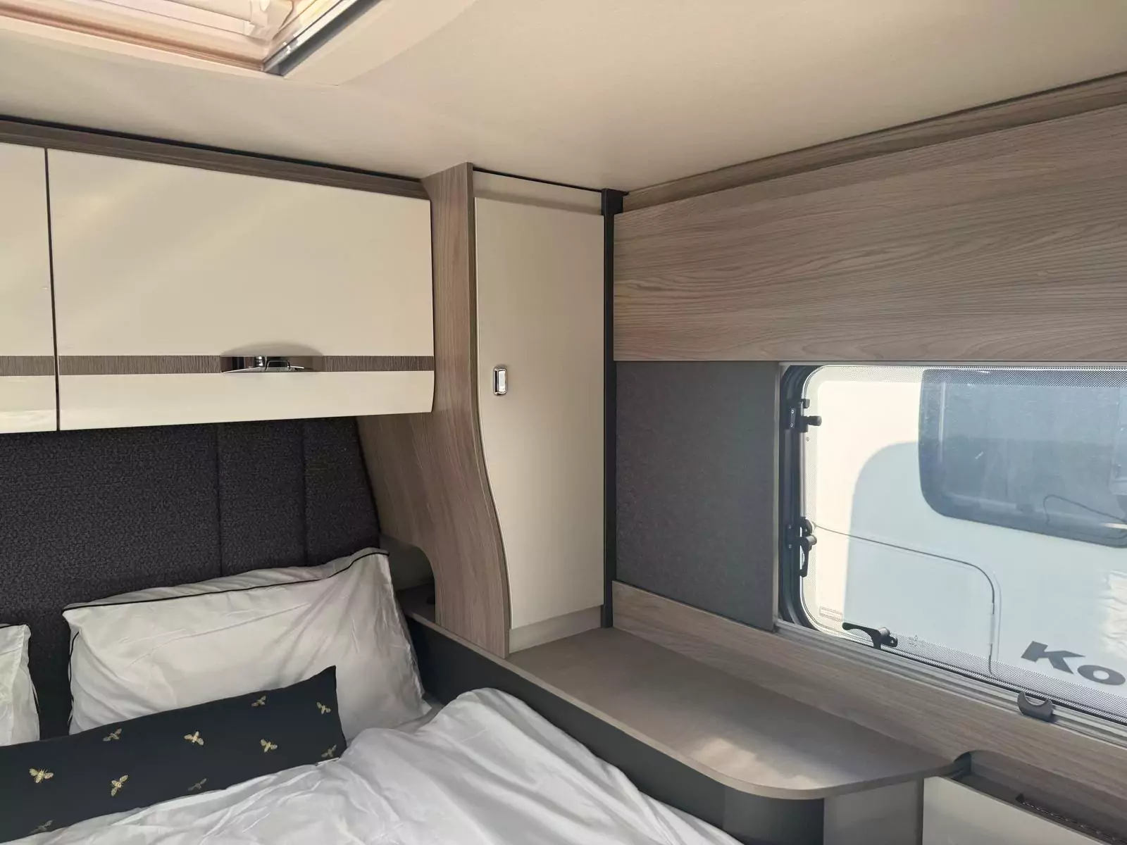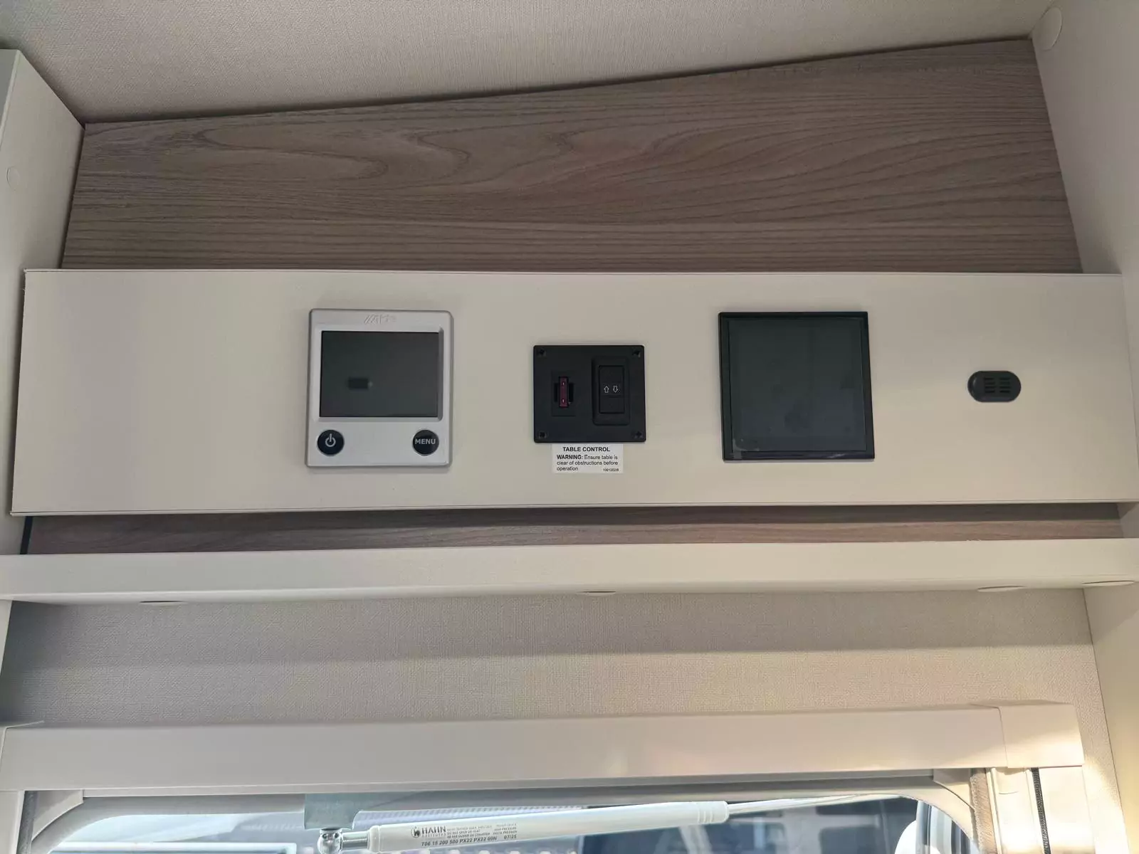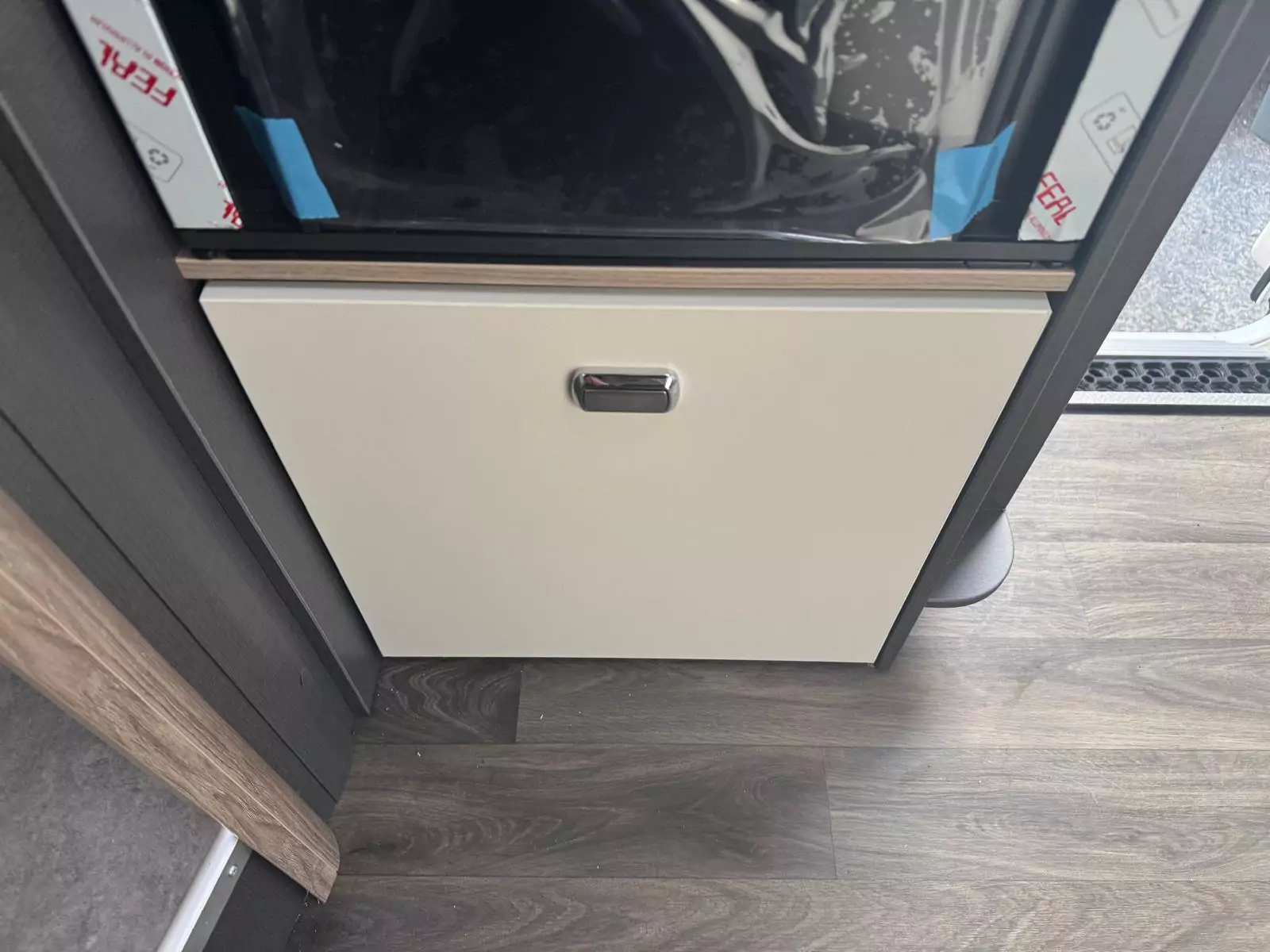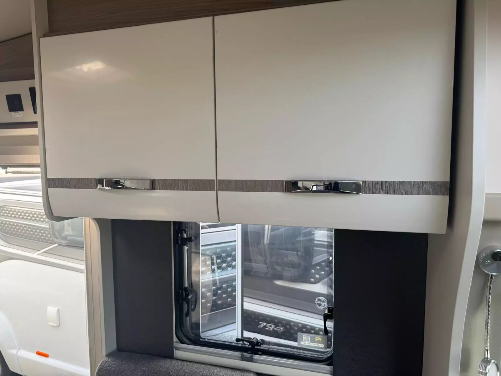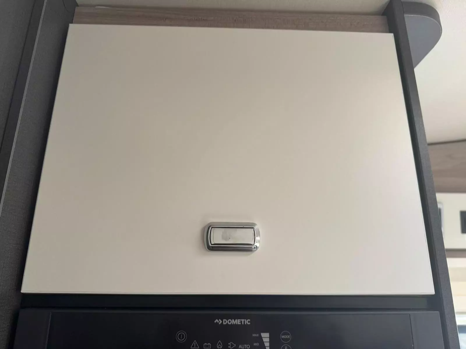 The kitchen is fully equipped for life on the move, featuring a Thetford Triplex oven and grill, three-burner gas hob with electric hotplate, and a 133L tall slimline Dometic fridge with removable freezer compartment. Practical design touches include a new textured Grit Gres worktop, slim stainless steel sink, illuminated splashback, and extra worktop extensions for added prep space. Dining is equally versatile, thanks to front parallel lounge layouts with fold-down travelling seats and optional Mapa electric rise-and-fall tables.
