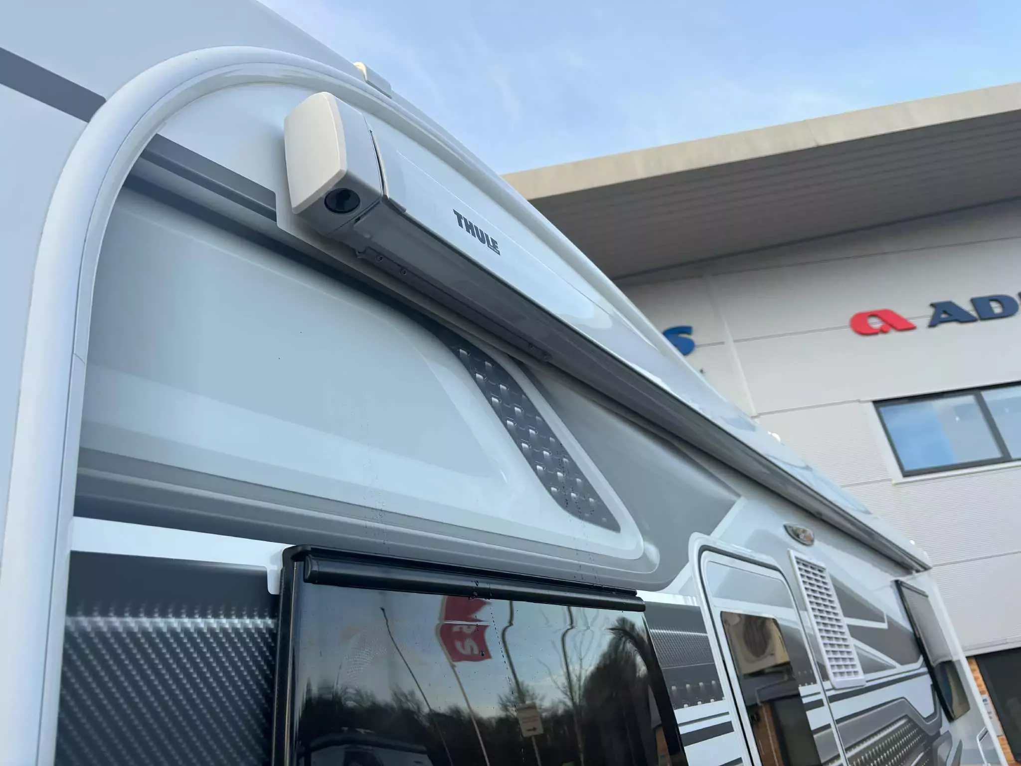 The kitchen is designed for both style and function, equipped with a Thetford thermostatic oven and separate grill, a dual-fuel hob with electric hotplate, a built-in microwave, and a choice of large 133L or 177L Dometic fridges depending on model. Practical additions like soft-close deep drawers, utensil racks, and an illuminated splashback ensure meal preparation is effortless. The washroom is equally indulgent, with separate shower, Ecocamel Jetstorm showerhead, decorative illuminated panels, and premium fittings, creating a boutique hotel feel on the road.