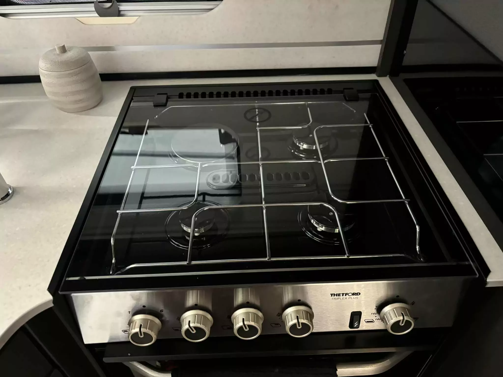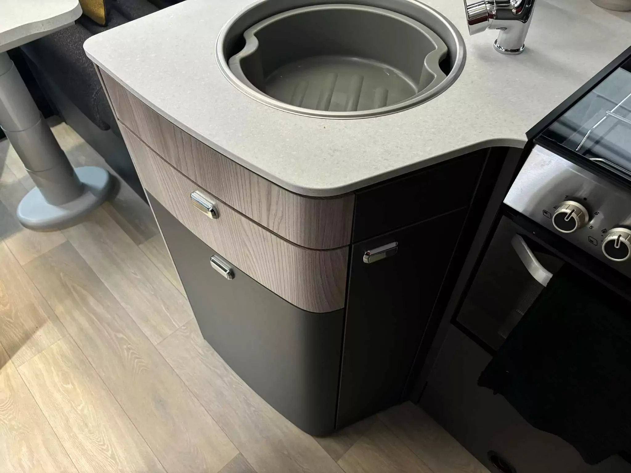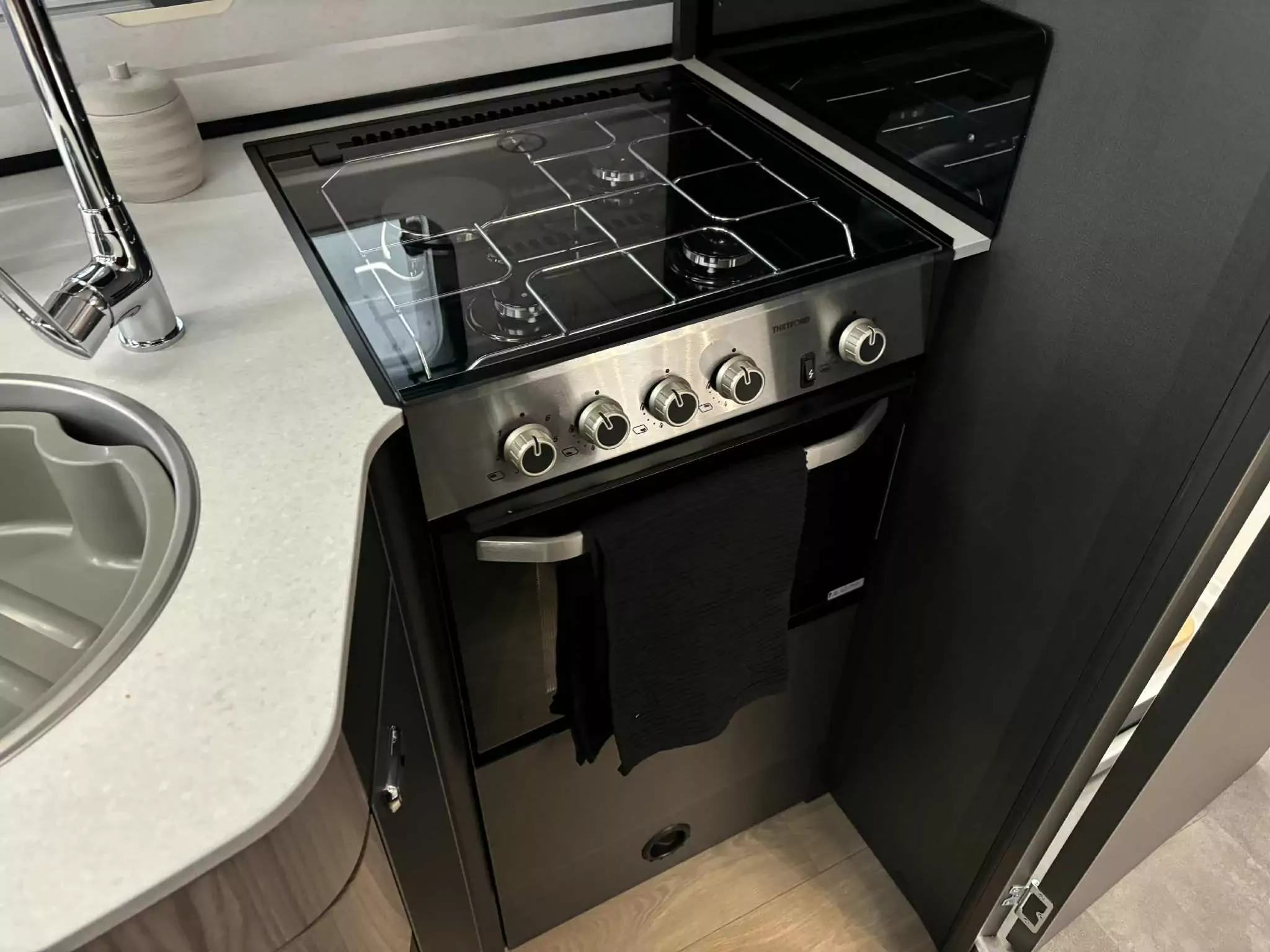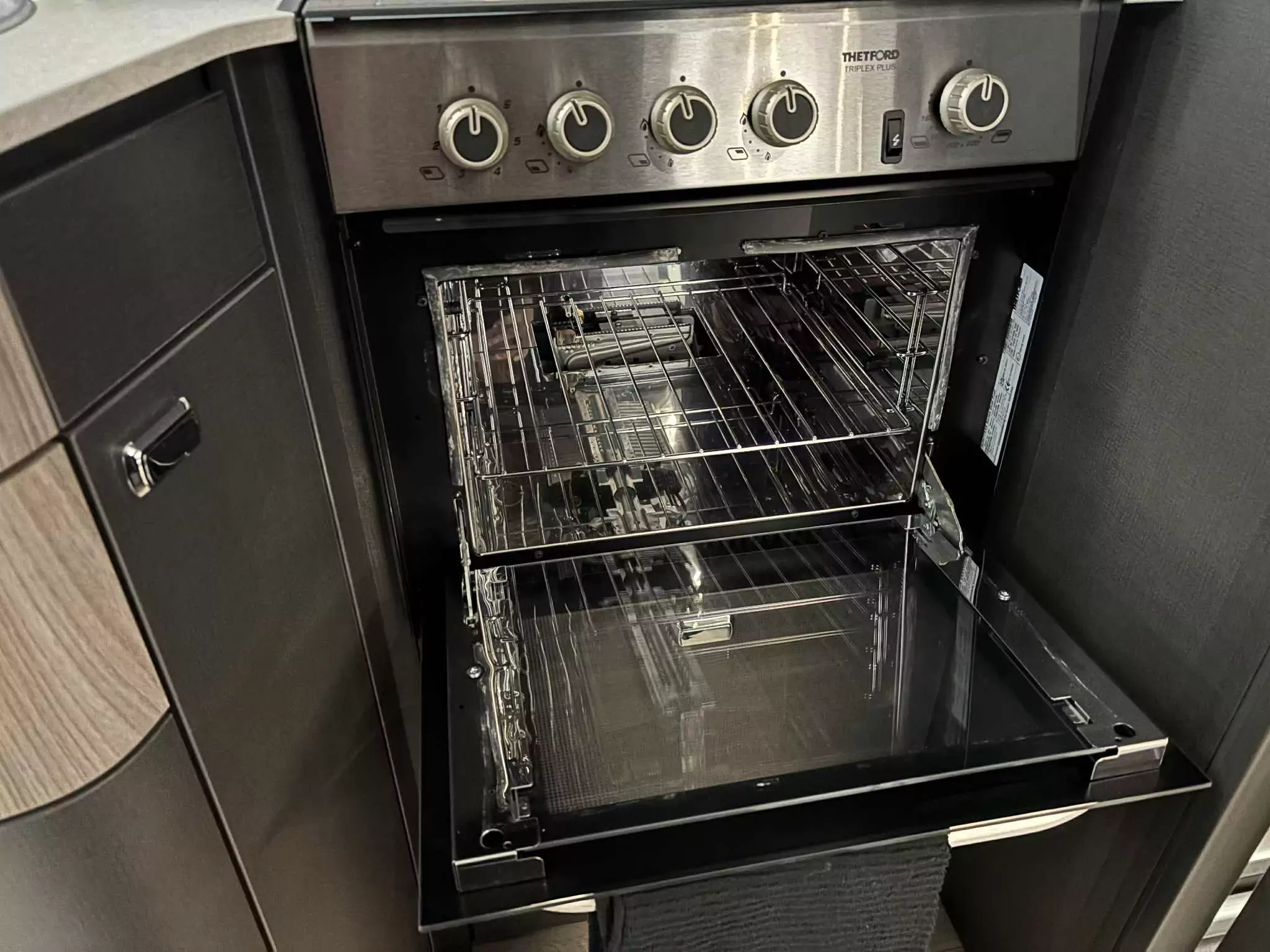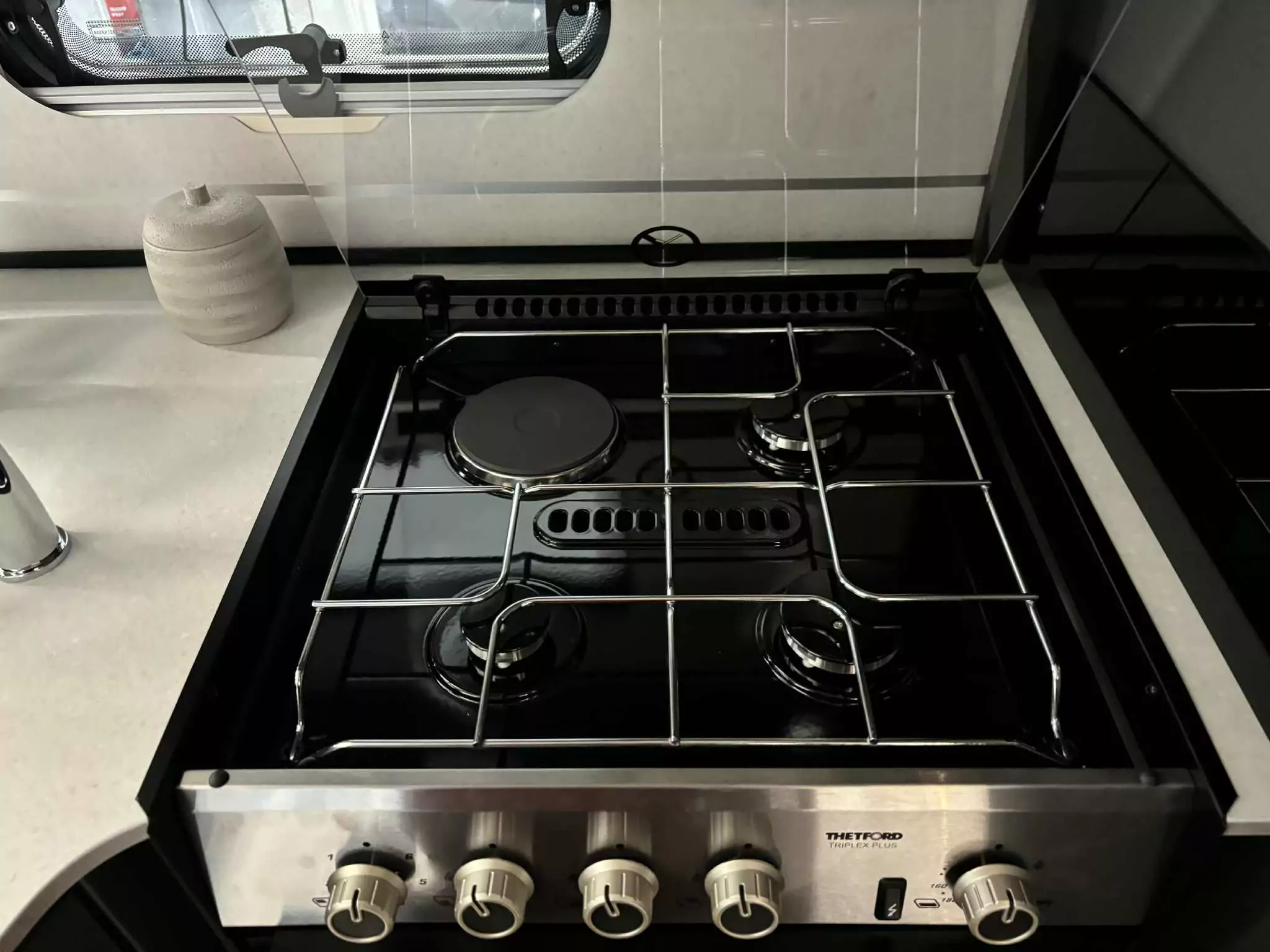 The well-appointed kitchen features a Thetford oven and grill, a three-burner gas hob with electric hotplate and electronic ignition, plus a Dometic 133-litre tall slimline fridge with automatic energy selection and removable freezer compartment. A practical washroom and Truma CombiNeo heating and hot water system ensure year-round comfort, whether on UK touring breaks or longer European adventures.
