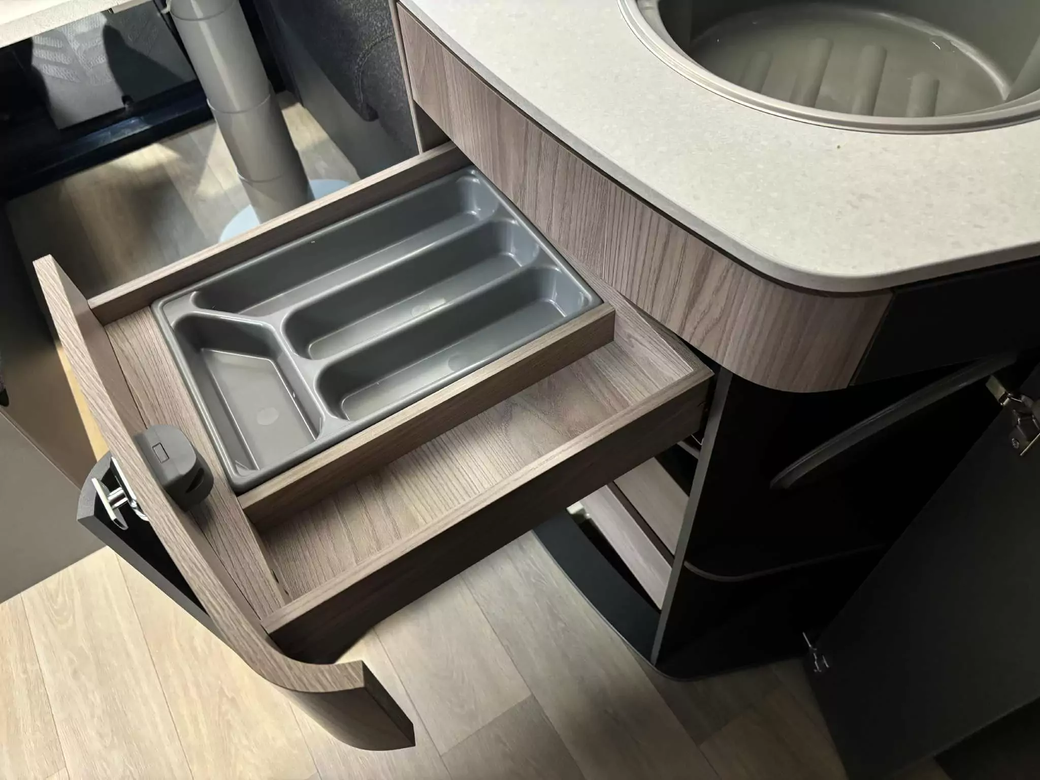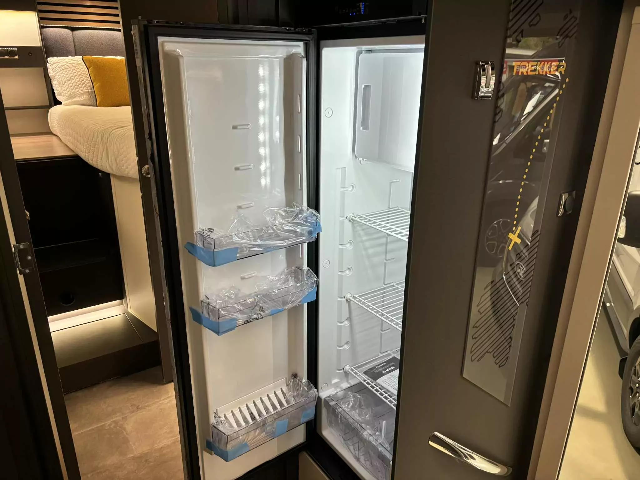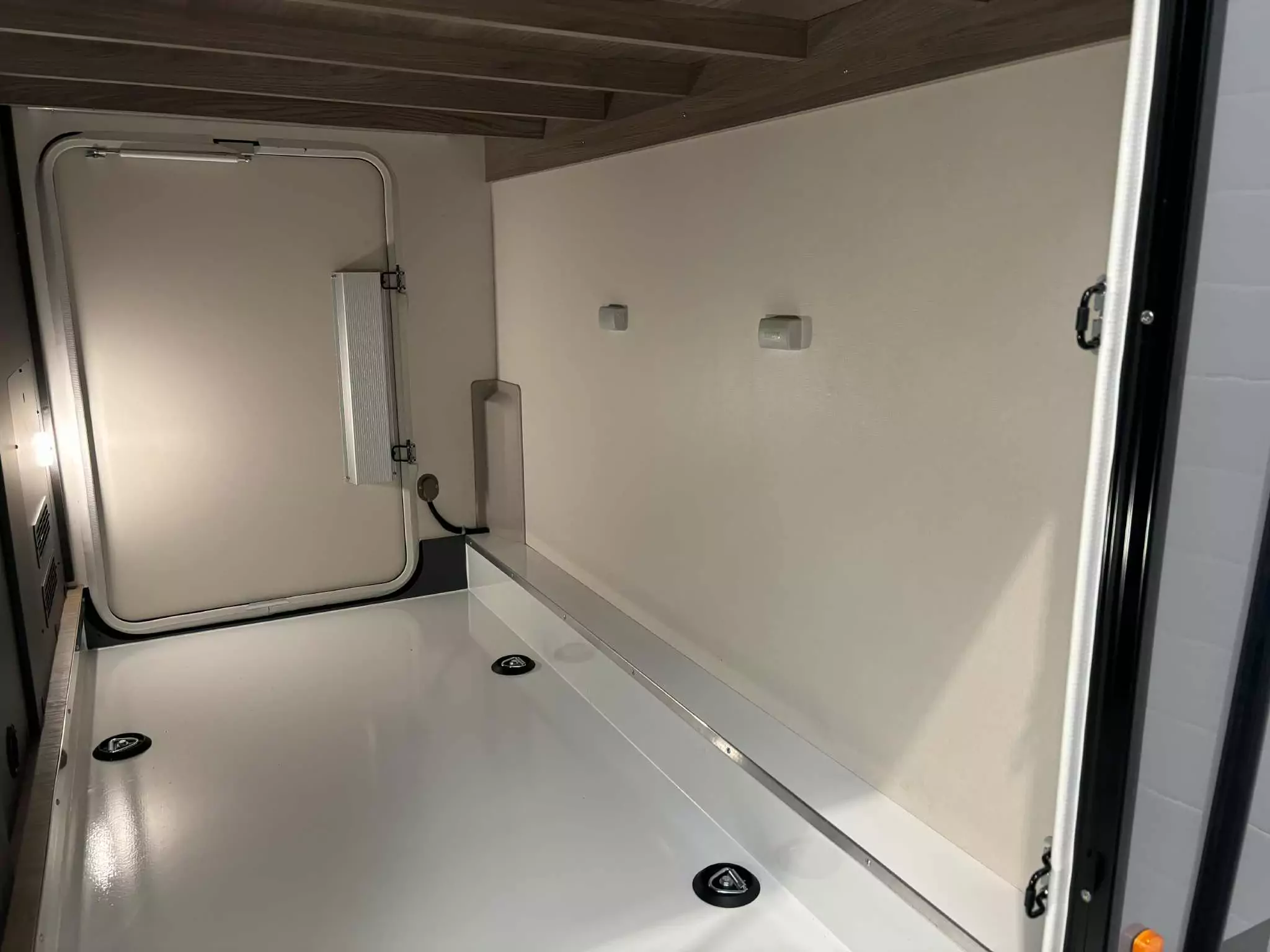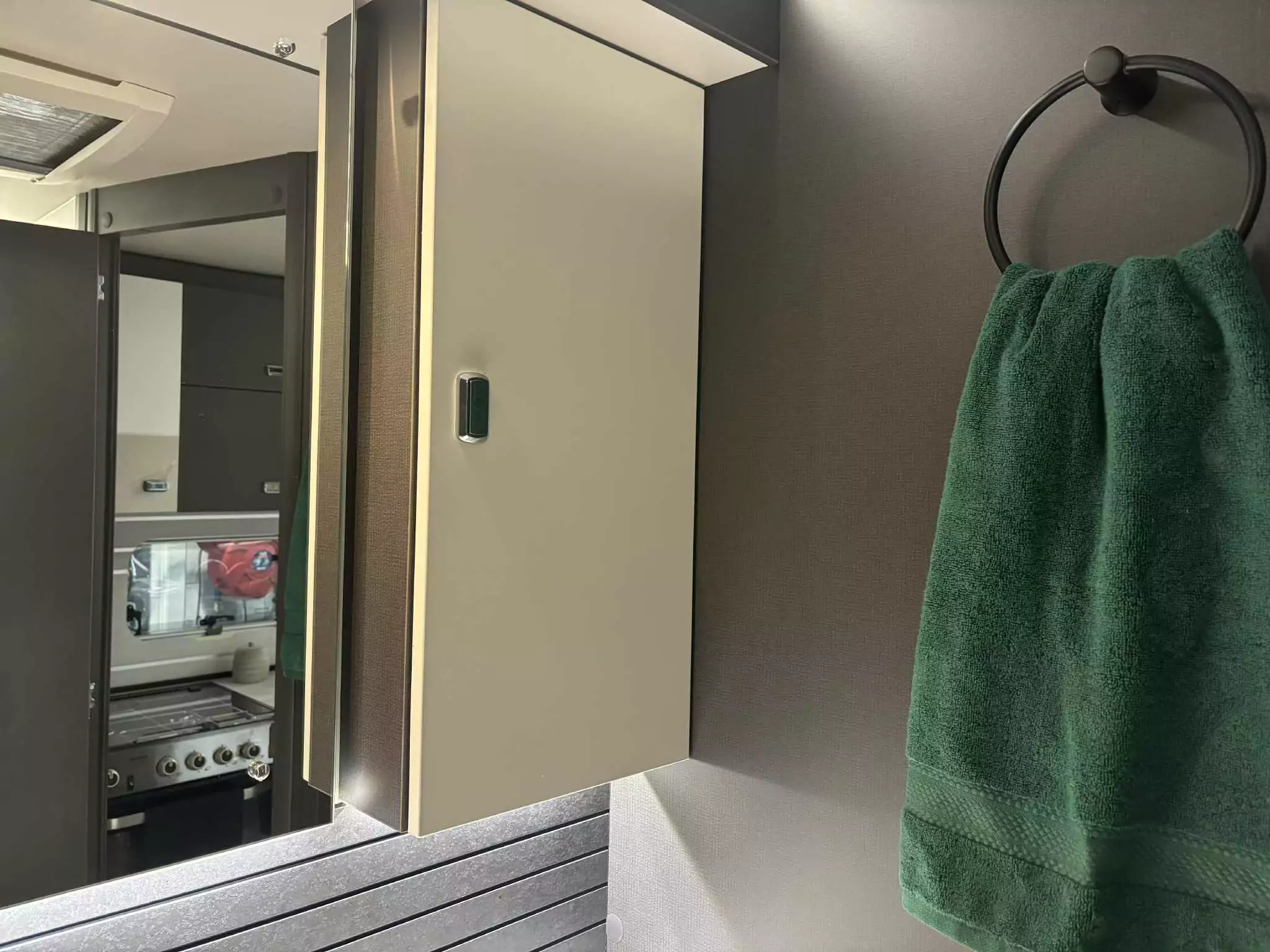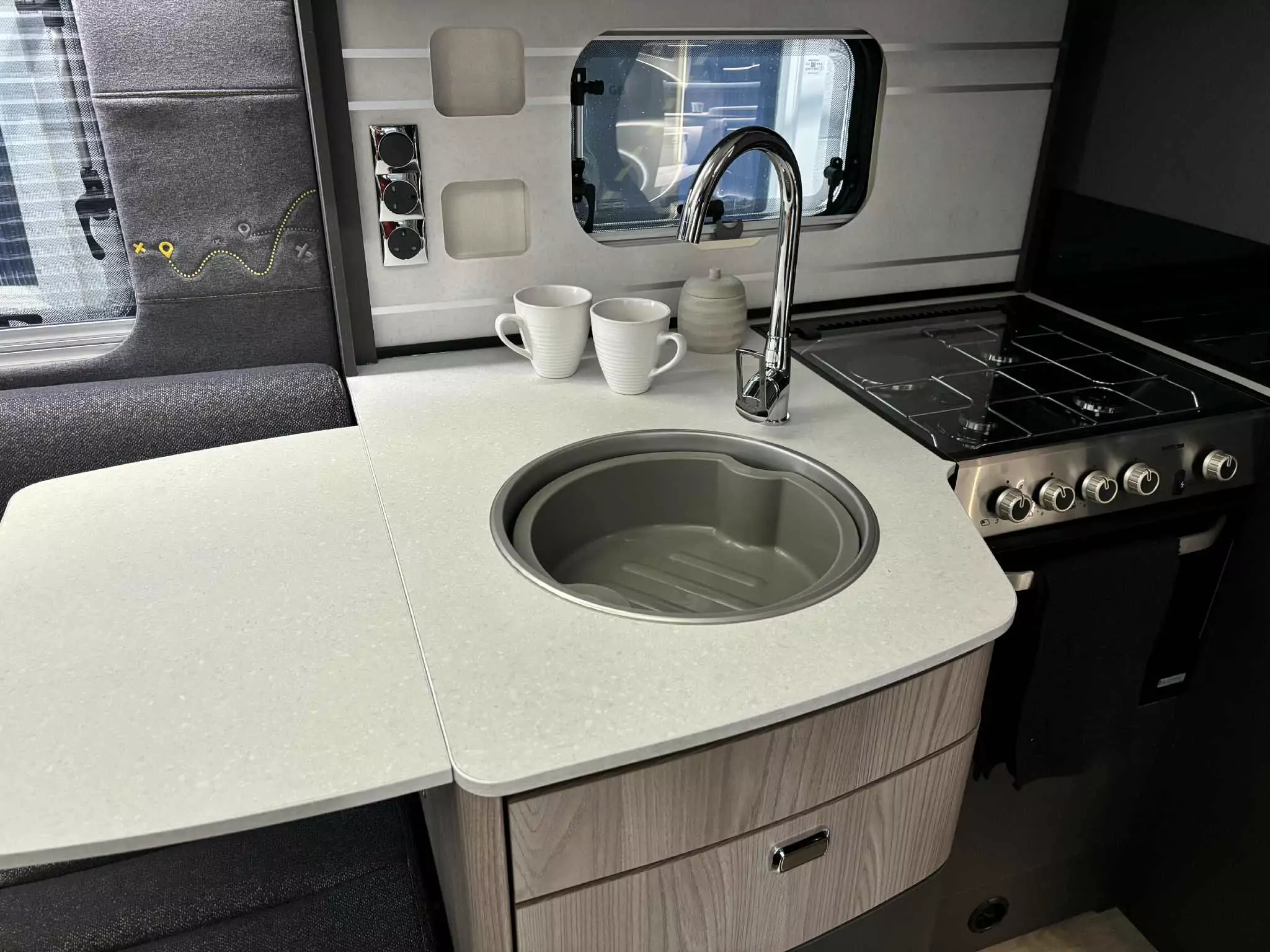 The well-appointed kitchen features a Thetford oven and grill, a three-burner gas hob with electric hotplate and electronic ignition, plus a Dometic 133-litre tall slimline fridge with automatic energy selection and removable freezer compartment. A practical washroom and Truma CombiNeo heating and hot water system ensure year-round comfort, whether on UK touring breaks or longer European adventures.