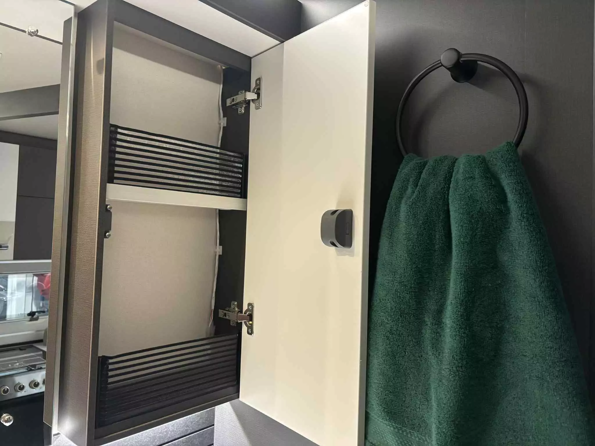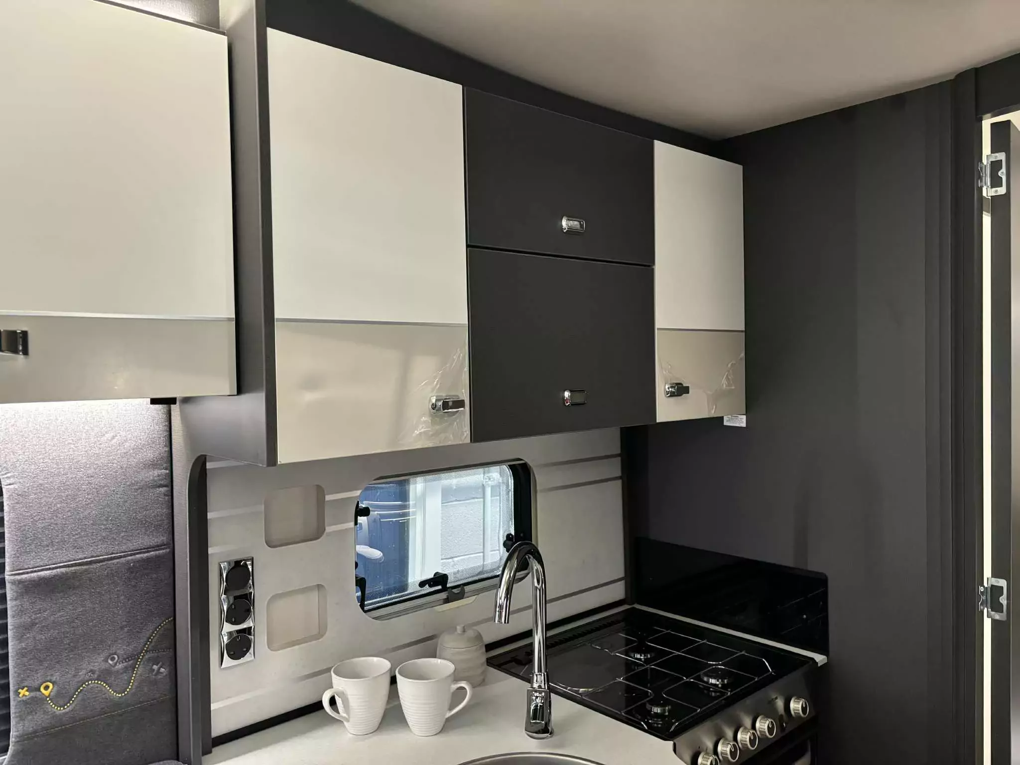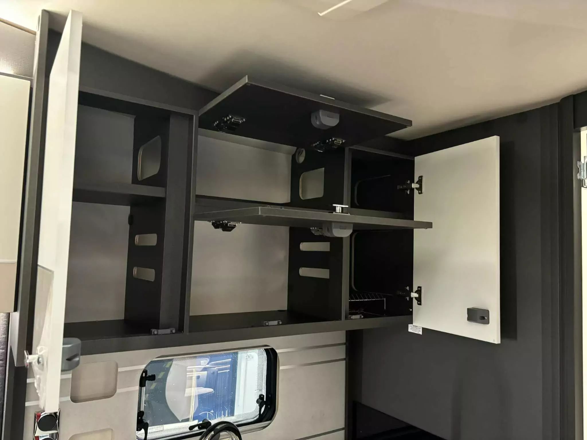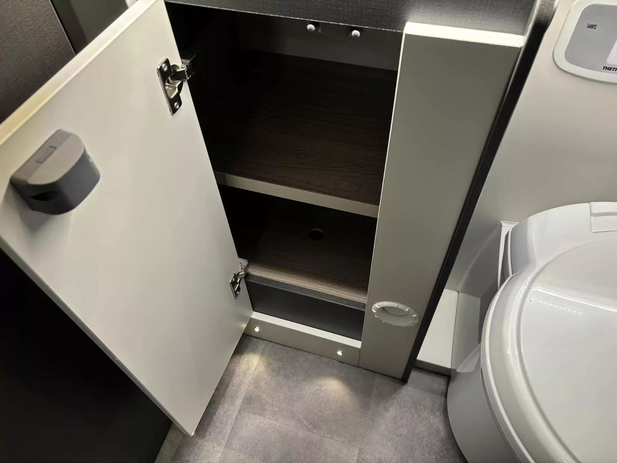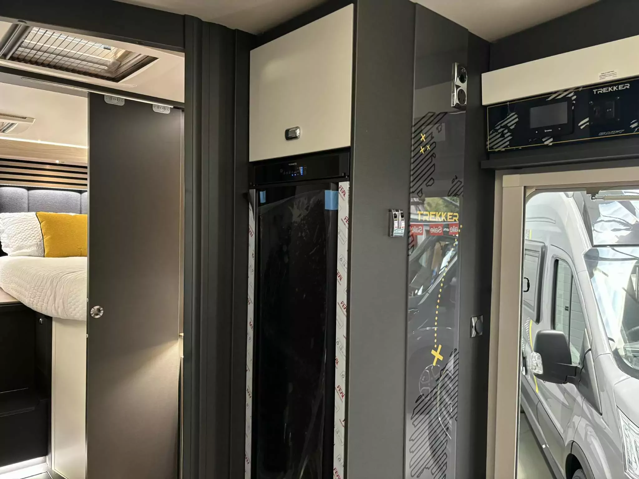 The well-appointed kitchen features a Thetford oven and grill, a three-burner gas hob with electric hotplate and electronic ignition, plus a Dometic 133-litre tall slimline fridge with automatic energy selection and removable freezer compartment. A practical washroom and Truma CombiNeo heating and hot water system ensure year-round comfort, whether on UK touring breaks or longer European adventures.