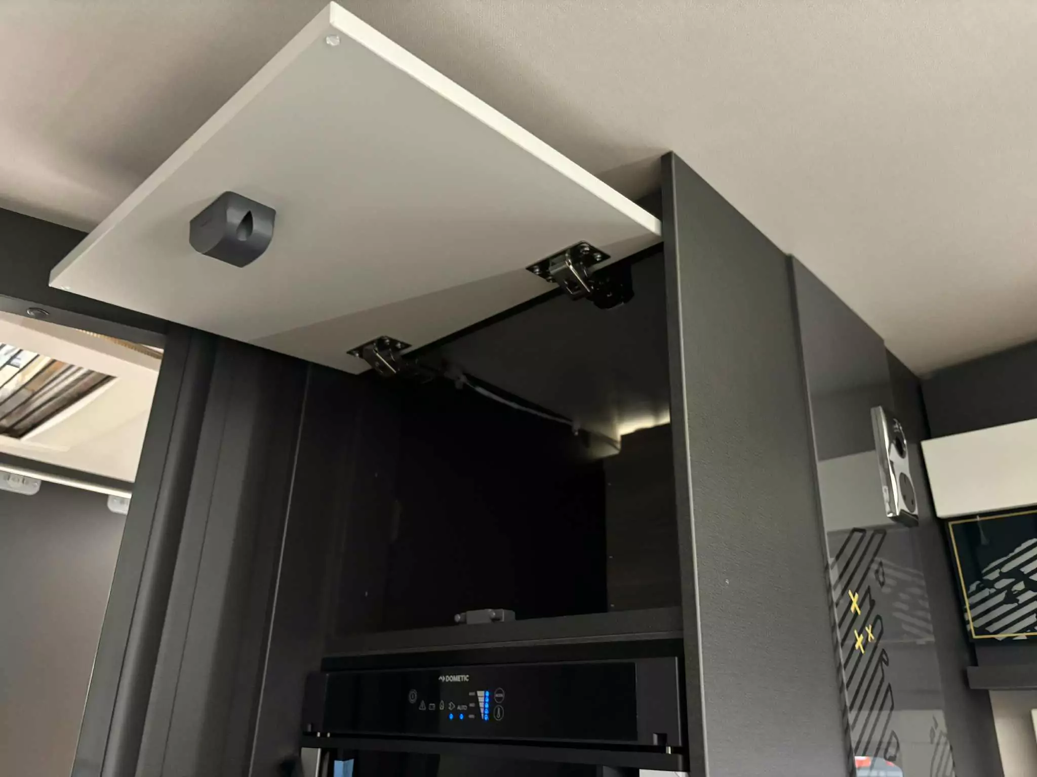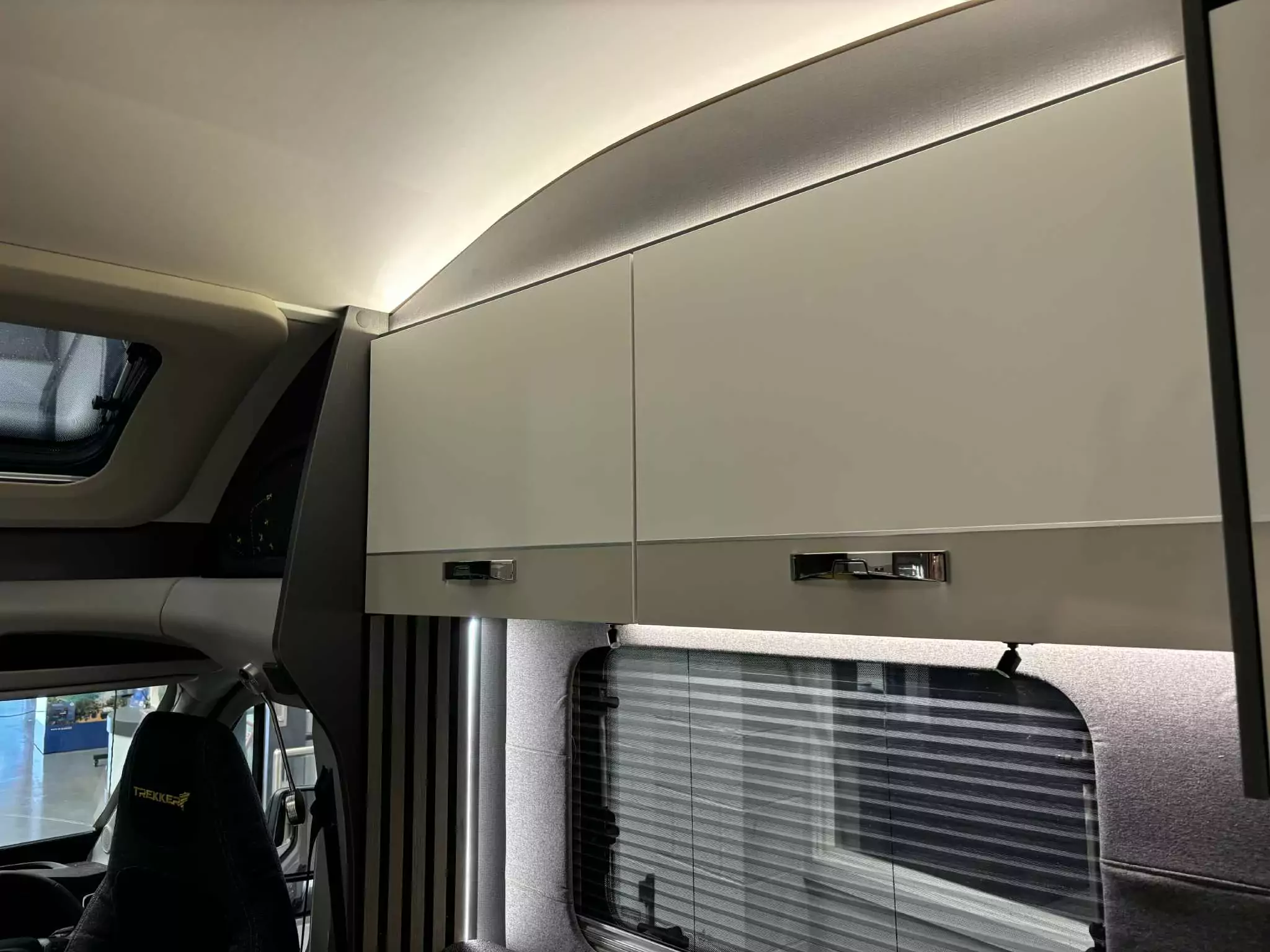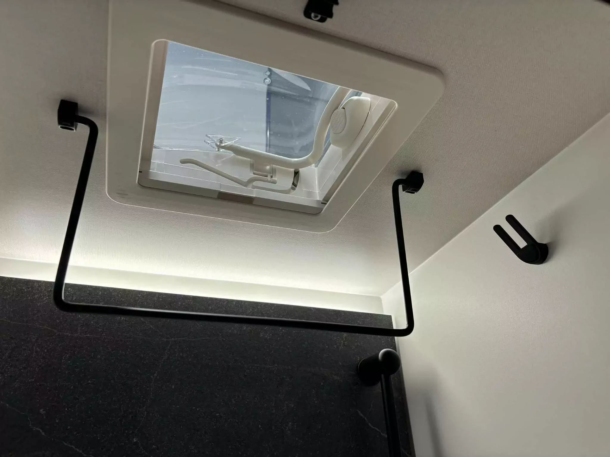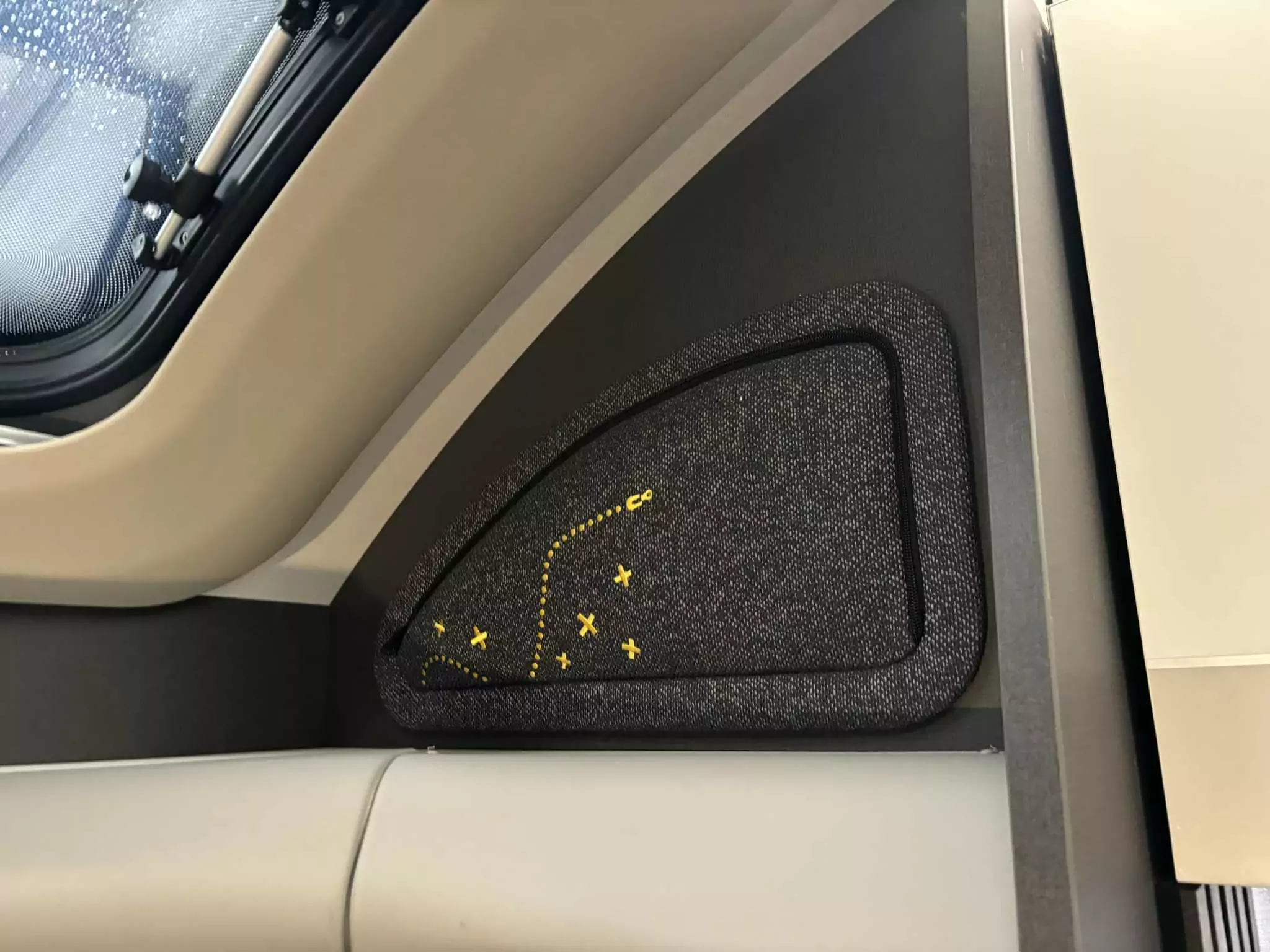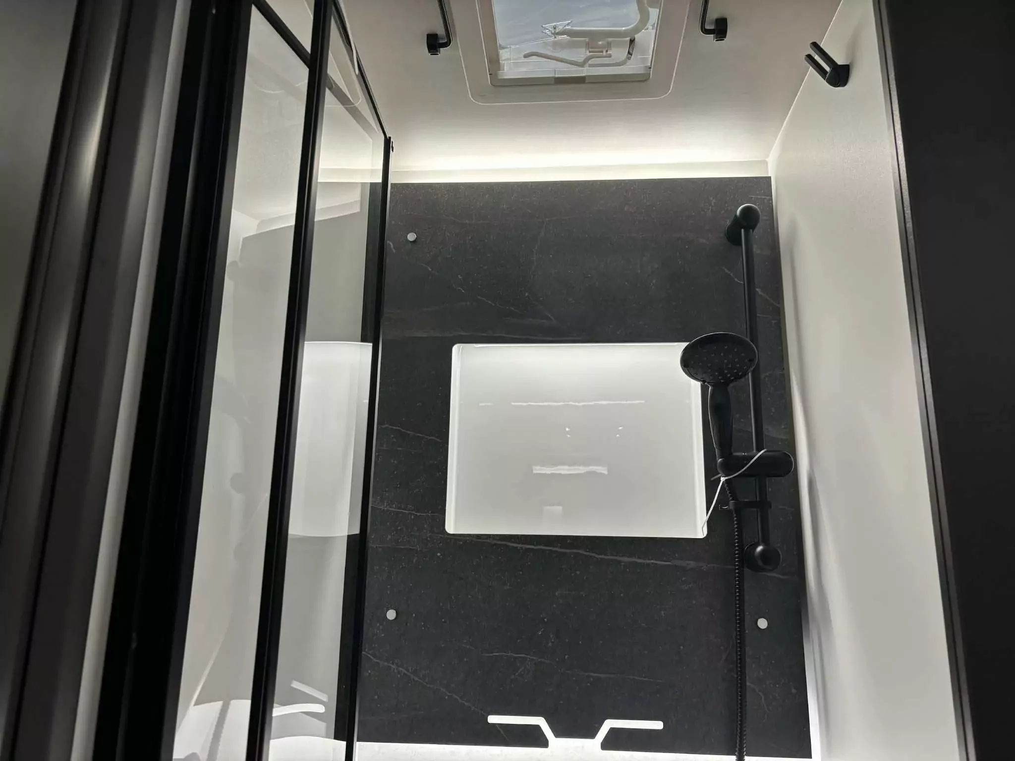 The well-appointed kitchen features a Thetford oven and grill, a three-burner gas hob with electric hotplate and electronic ignition, plus a Dometic 133-litre tall slimline fridge with automatic energy selection and removable freezer compartment. A practical washroom and Truma CombiNeo heating and hot water system ensure year-round comfort, whether on UK touring breaks or longer European adventures.