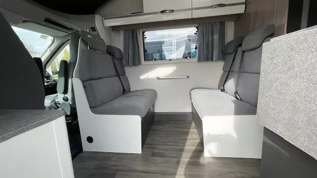 Everyday living is effortless with a fully equipped kitchen that includes a Thetford Triplex oven and grill, a three-burner gas hob with electric hotplate, a tall 133L Dometic fridge with removable freezer, and a new Grit Gres laminate worktop with slim stainless steel sink and illuminated splashback. Dining is flexible too, thanks to revolving captain’s chairs, smart dinette layouts, and the Mapa electric rise-and-fall table in 5 Series models.
