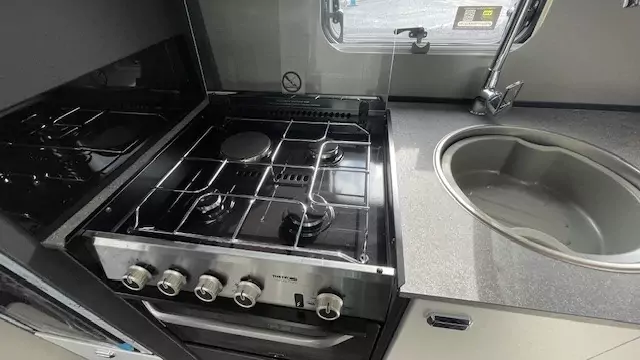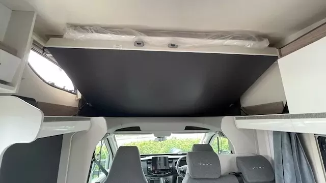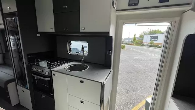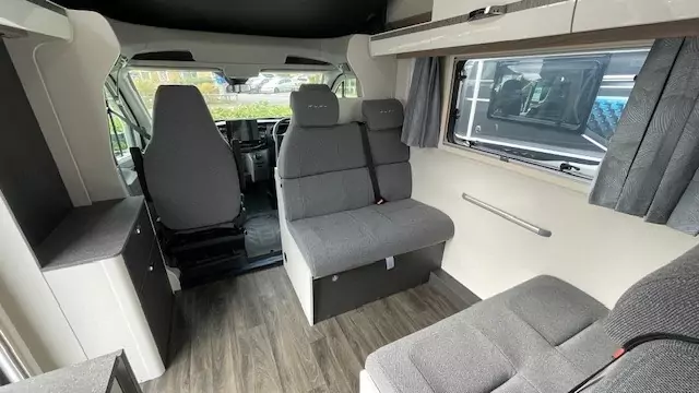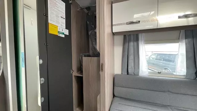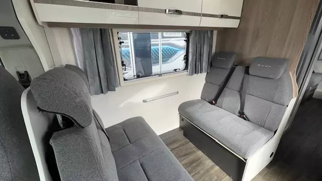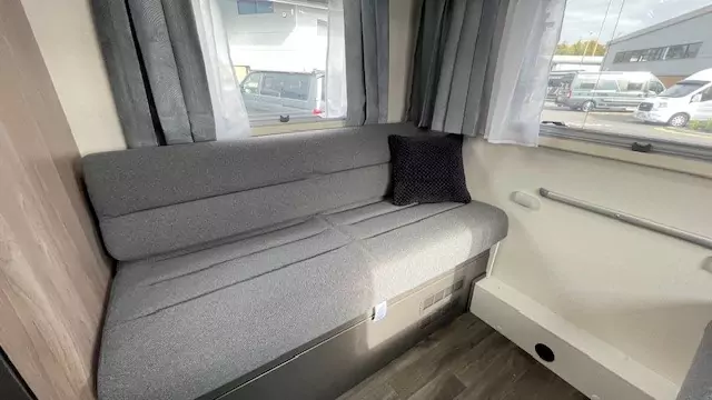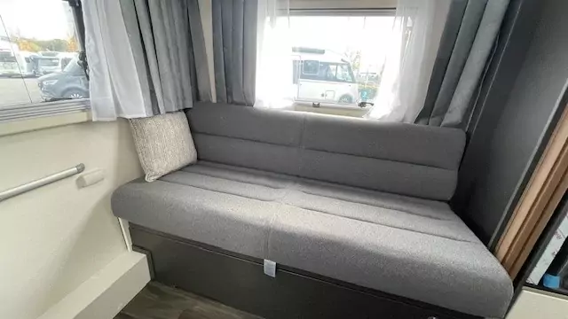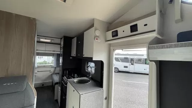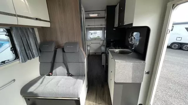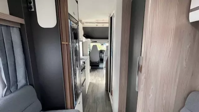 Step inside and you’ll find a refreshed Slate soft furnishing scheme, stain-resistant, easy-to-clean fabrics, and decorative Sangallo Elm woodgrain with modern gloss finishes. The interior is bright and spacious with a high 2110mm roof height, removable carpets, and smart storage solutions designed with families in mind. Sleeping arrangements are versatile, from fixed Duvalay Duvalite Alto mattresses to height-adjustable drop-down beds or overcab beds, ensuring everyone gets a restful night’s sleep.