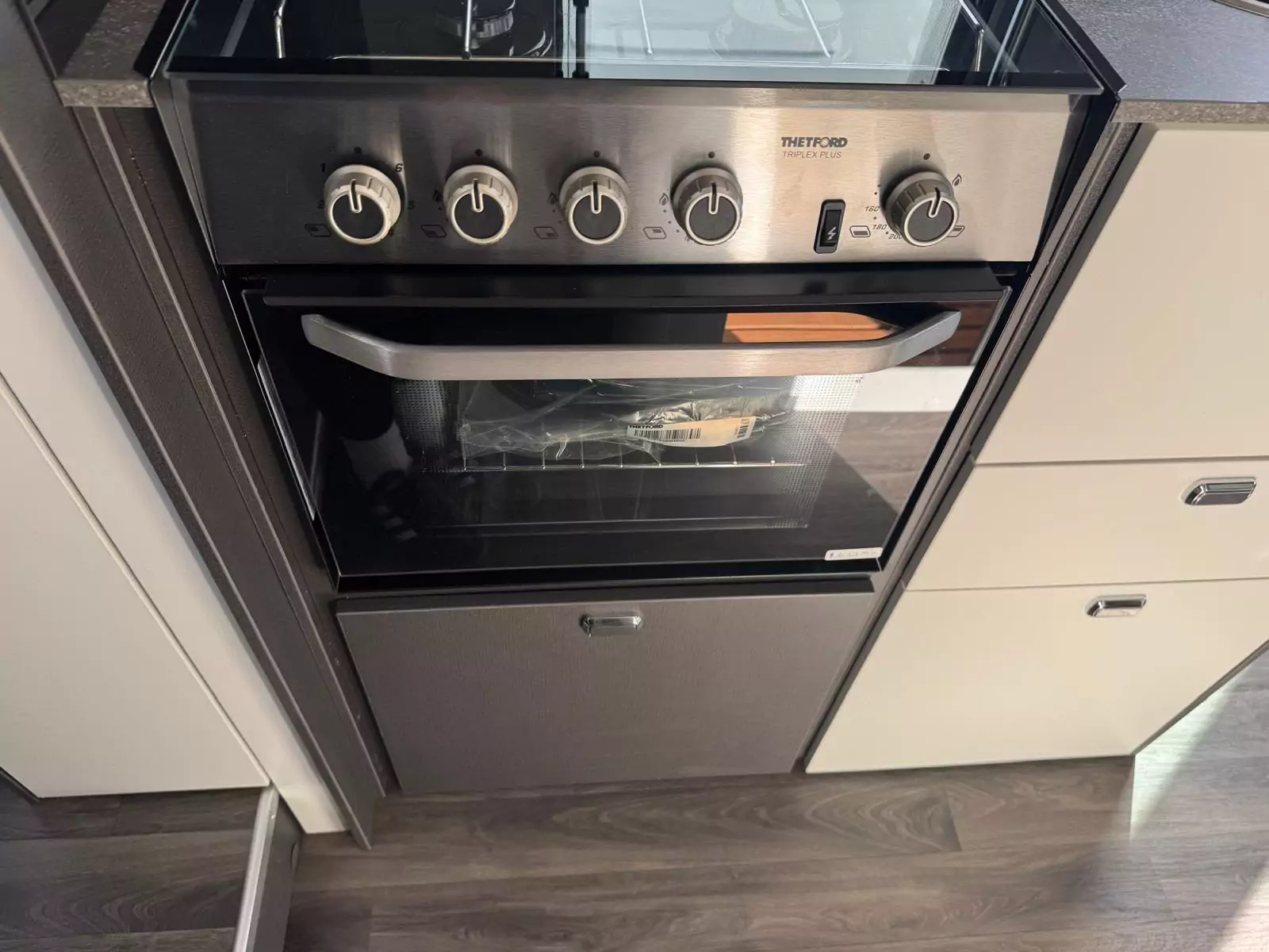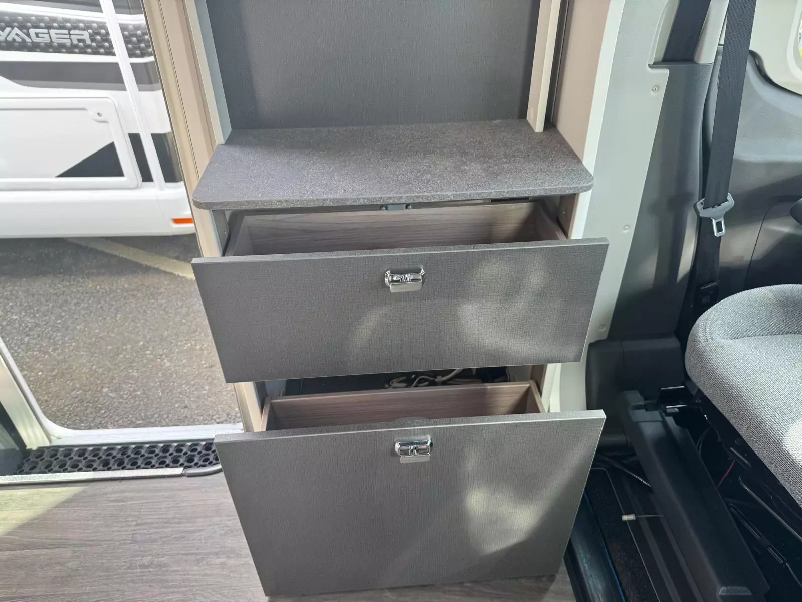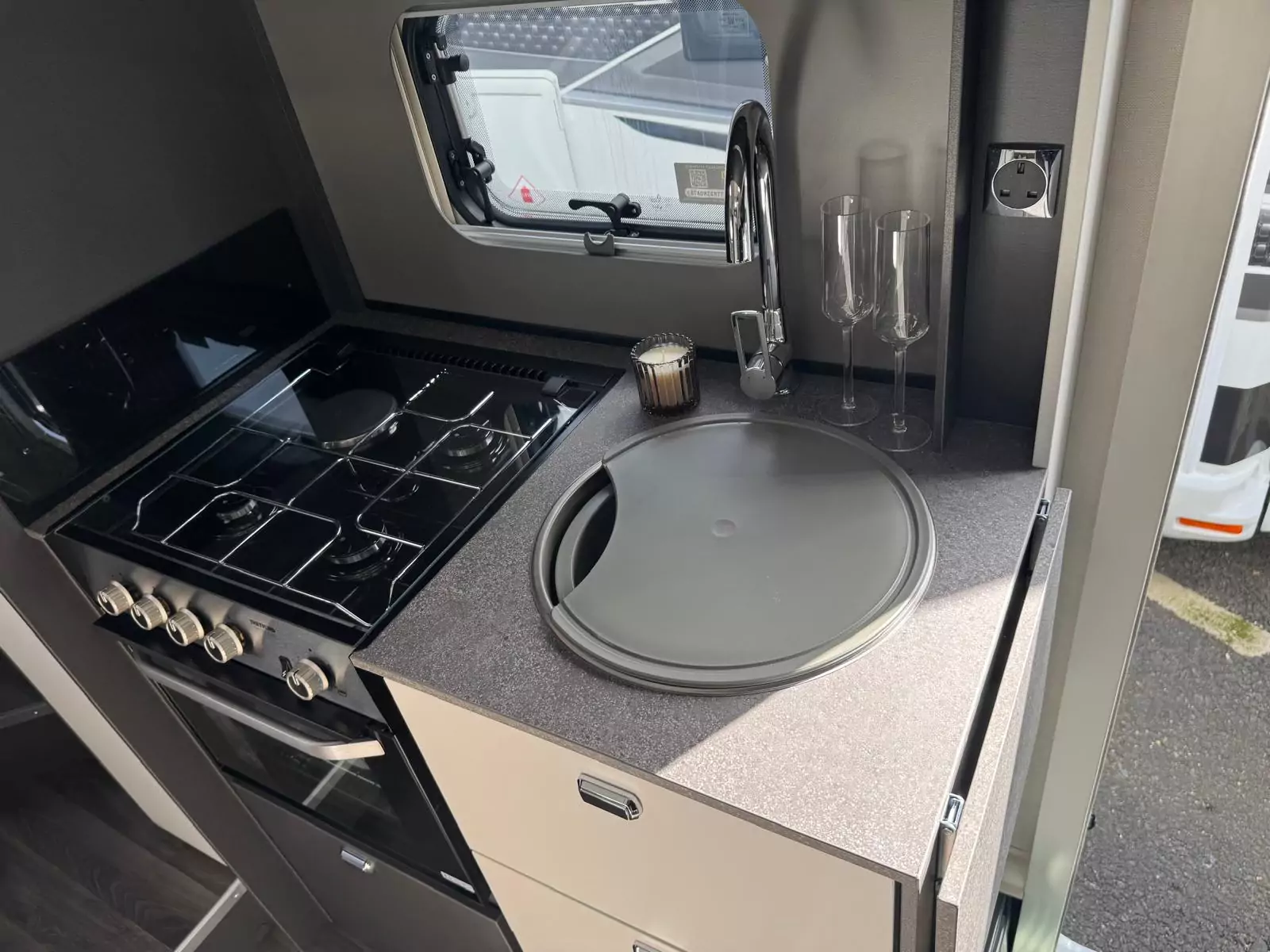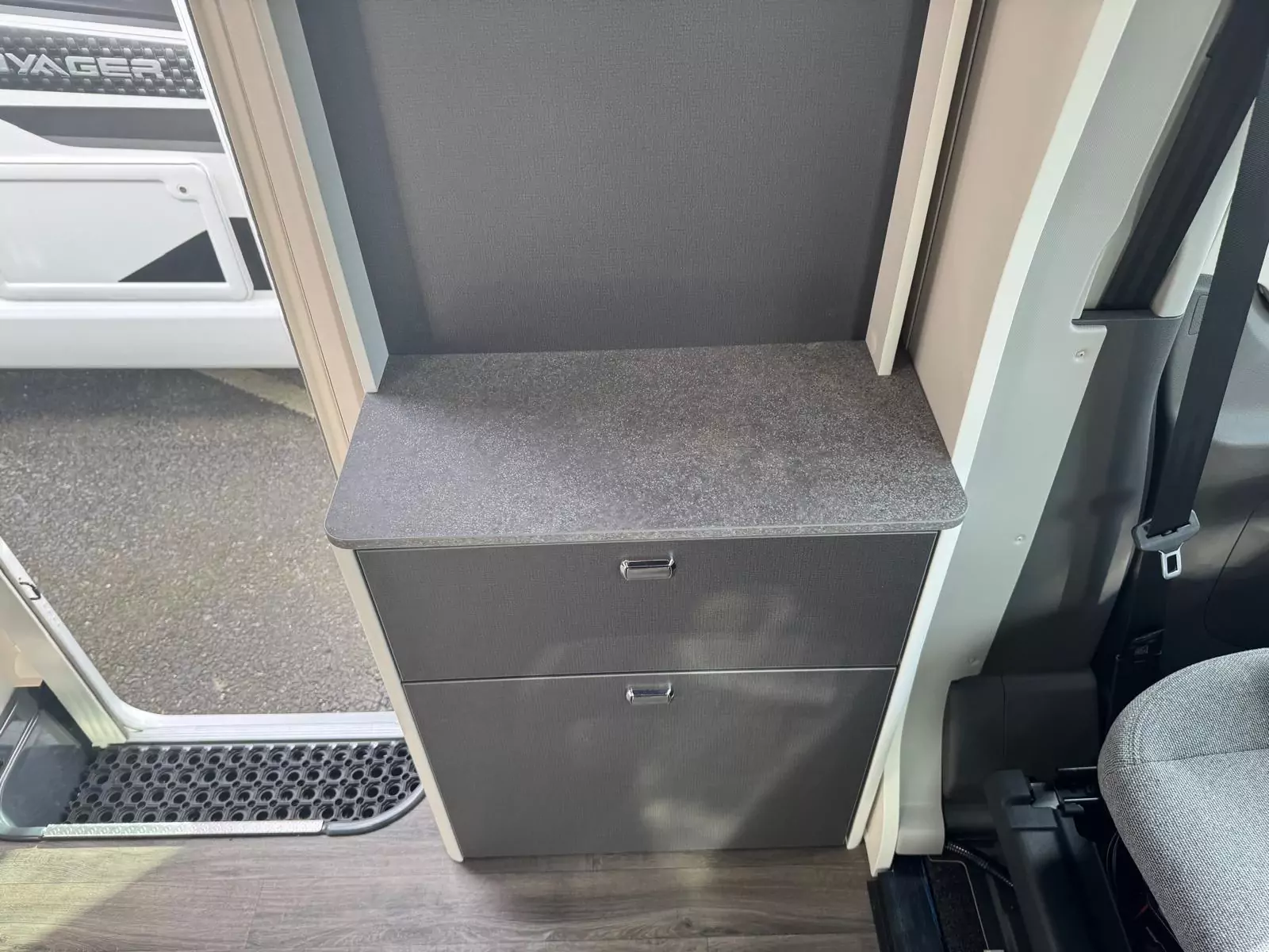 Everyday living is effortless with a fully equipped kitchen that includes a Thetford Triplex oven and grill, a three-burner gas hob with electric hotplate, a tall 133L Dometic fridge with removable freezer, and a new Grit Gres laminate worktop with slim stainless steel sink and illuminated splashback. Dining is flexible too, thanks to revolving captain’s chairs, smart dinette layouts, and the Mapa electric rise-and-fall table in 5 Series models.