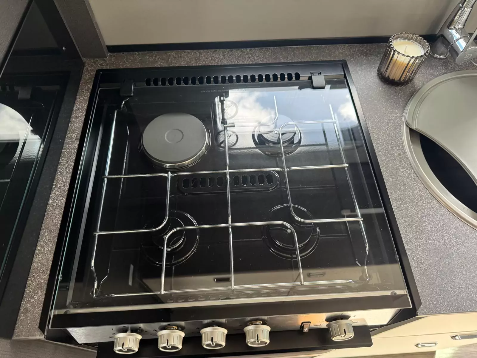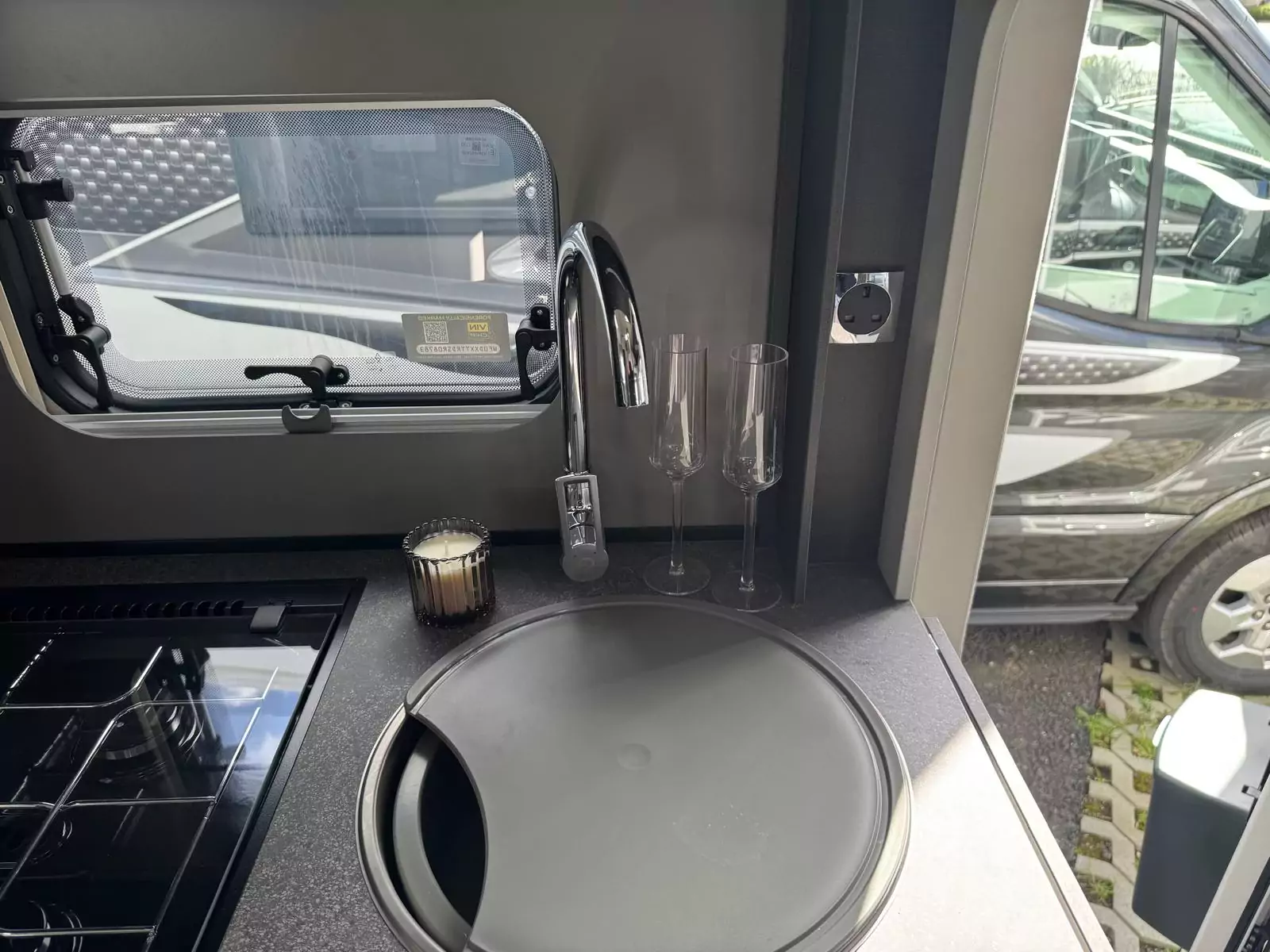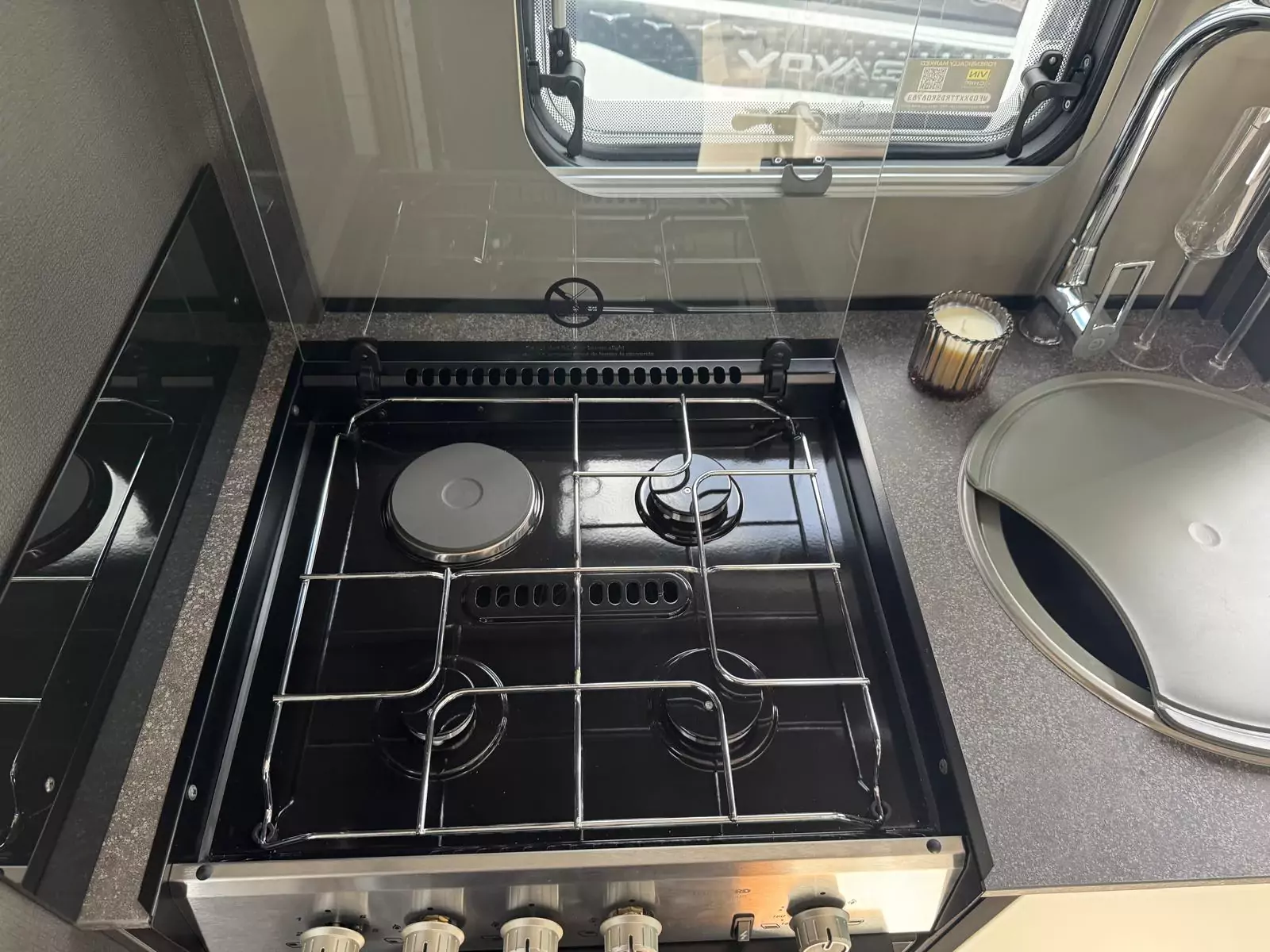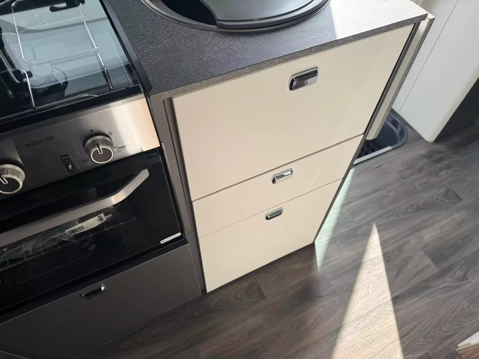 Everyday living is effortless with a fully equipped kitchen that includes a Thetford Triplex oven and grill, a three-burner gas hob with electric hotplate, a tall 133L Dometic fridge with removable freezer, and a new Grit Gres laminate worktop with slim stainless steel sink and illuminated splashback. Dining is flexible too, thanks to revolving captain’s chairs, smart dinette layouts, and the Mapa electric rise-and-fall table in 5 Series models.