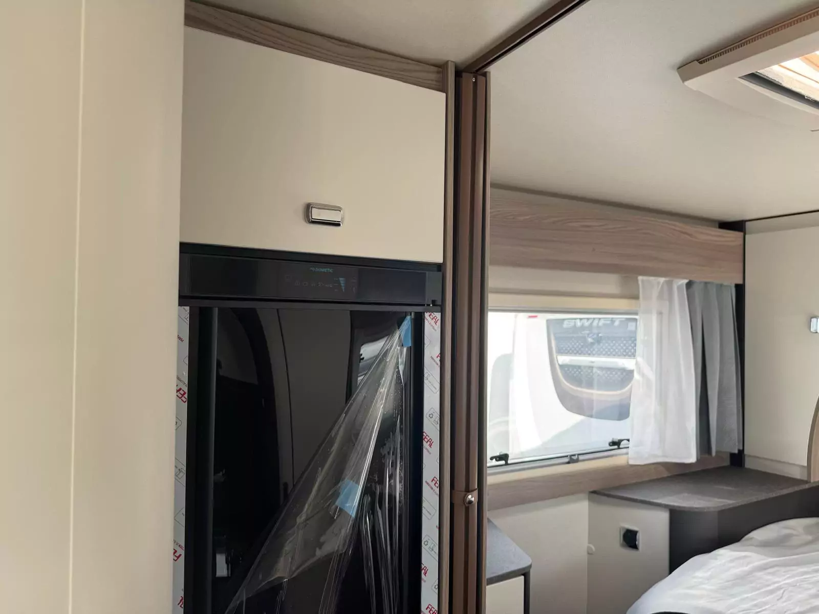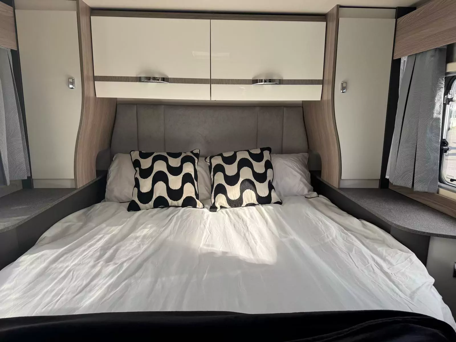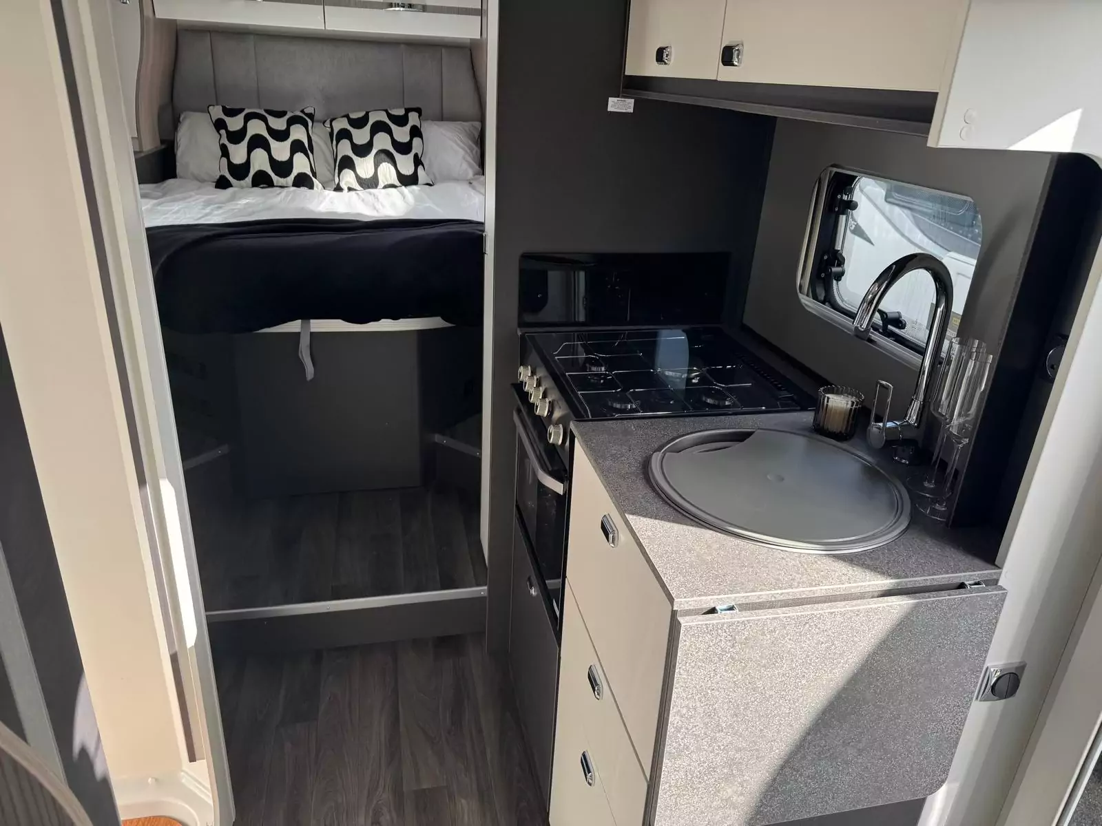 Step inside and you’ll find a refreshed Slate soft furnishing scheme, stain-resistant, easy-to-clean fabrics, and decorative Sangallo Elm woodgrain with modern gloss finishes. The interior is bright and spacious with a high 2110mm roof height, removable carpets, and smart storage solutions designed with families in mind. Sleeping arrangements are versatile, from fixed Duvalay Duvalite Alto mattresses to height-adjustable drop-down beds or overcab beds, ensuring everyone gets a restful night’s sleep.