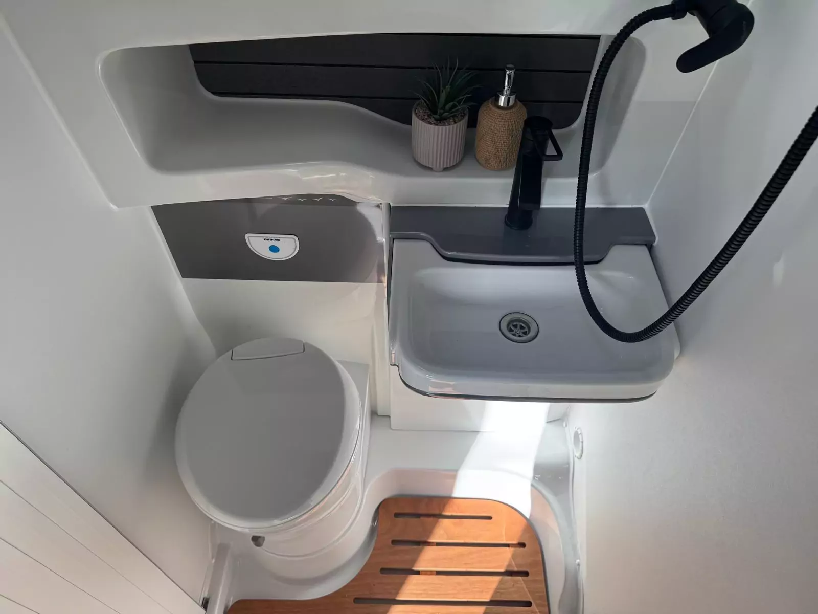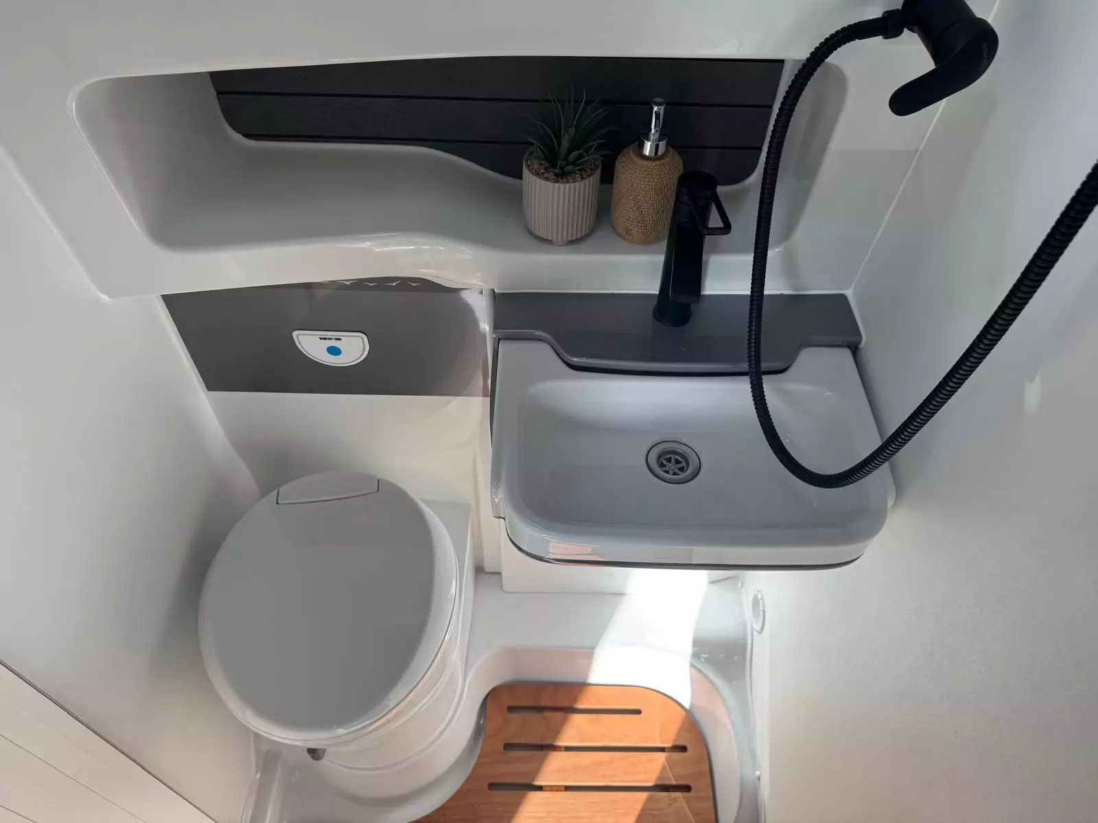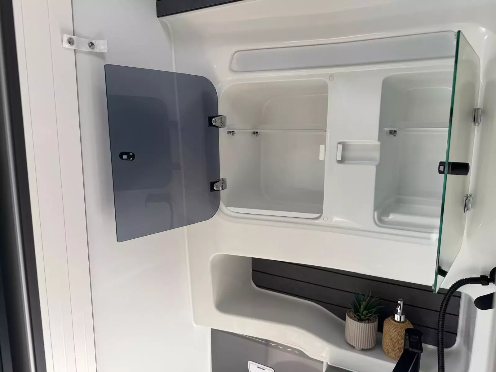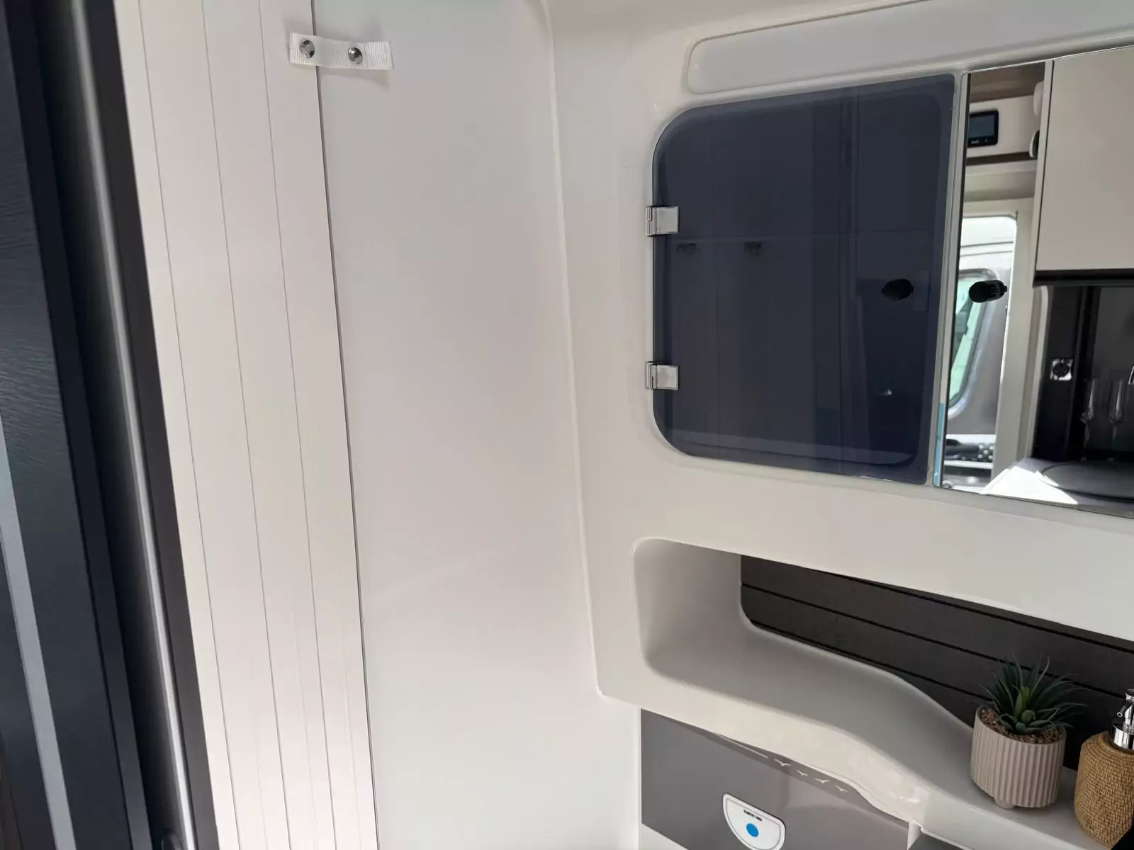 The washrooms have also been thoughtfully redesigned, featuring separate showers, foldaway basins, decorative illuminated panels, and Ecocamel Jetstorm showerheads that deliver a powerful flow while saving water. Practical touches such as concealed storage, waterproof fittings, and skylights with flyscreens make these spaces light, functional, and stylish.