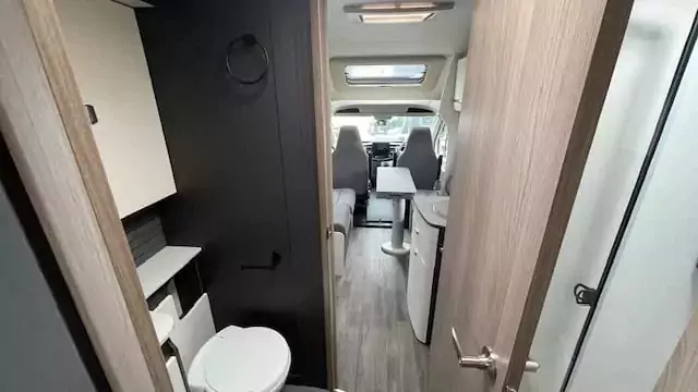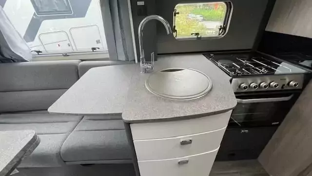 Everyday living is effortless with a fully equipped kitchen that includes a Thetford Triplex oven and grill, a three-burner gas hob with electric hotplate, a tall 133L Dometic fridge with removable freezer, and a new Grit Gres laminate worktop with slim stainless steel sink and illuminated splashback. Dining is flexible too, thanks to revolving captain’s chairs, smart dinette layouts, and the Mapa electric rise-and-fall table in 5 Series models.